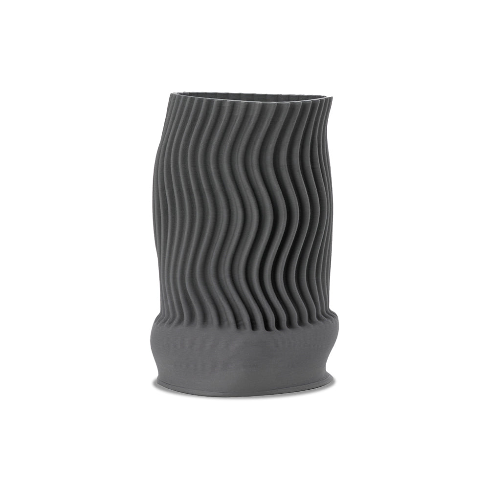 Crafted from dark grey 3D printed ceramic, it merges the contemporary with the organic. Wavy lines run down its silhouette, creating a captivating display of texture and visual interest. Enliven its sombre tones with a colourful assortment of flowers for a bold contrast that demands attention.