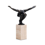 Sculpted from dark bronze alloy, the figure crouches in a poised stance, arms outstretched as if ready to take flight. The rich texture of the bronze contrasts beautifully with the smooth beige travertine base, creating a striking visual balance. Symbolising ambition and resilience, it adds depth and artistic flair to any interior.