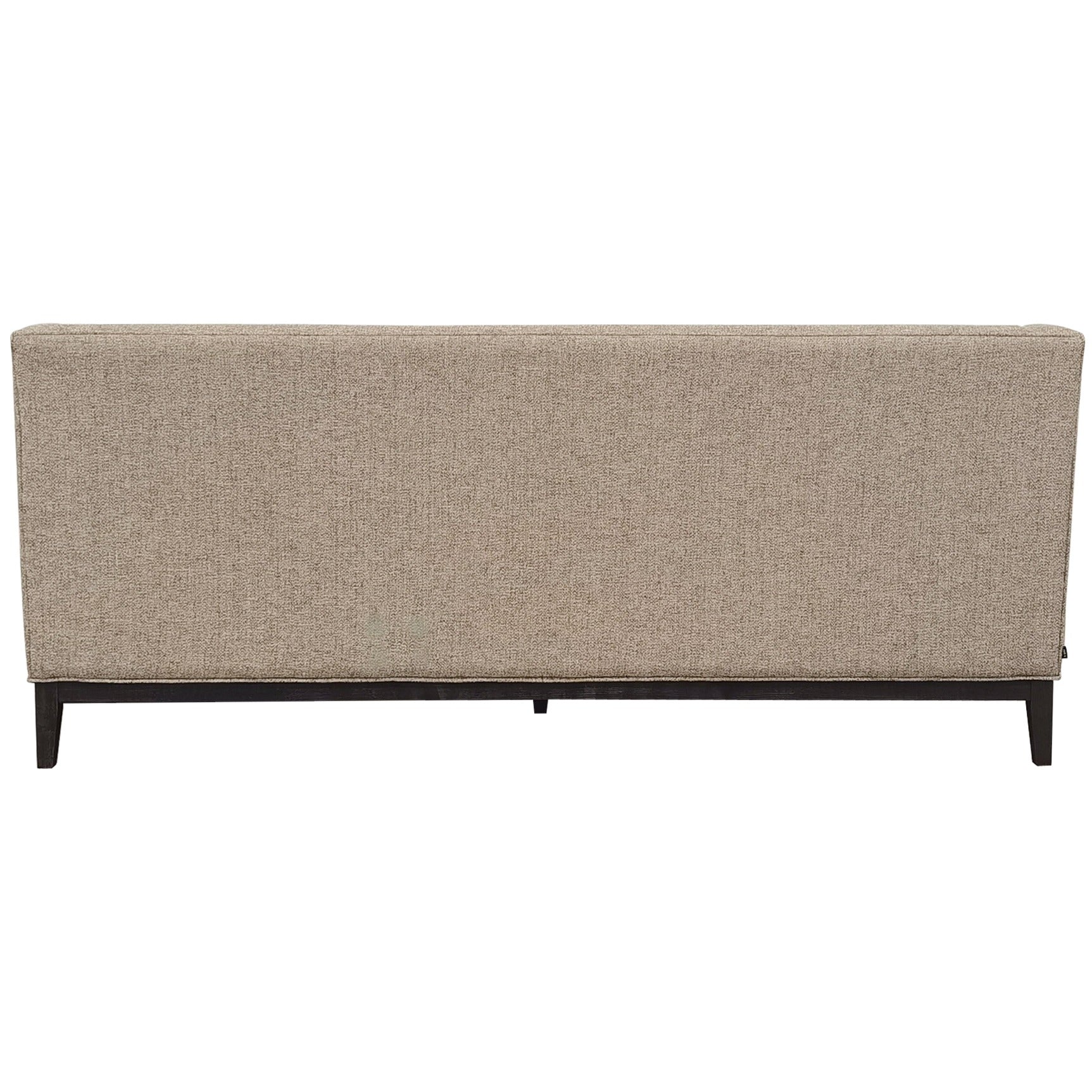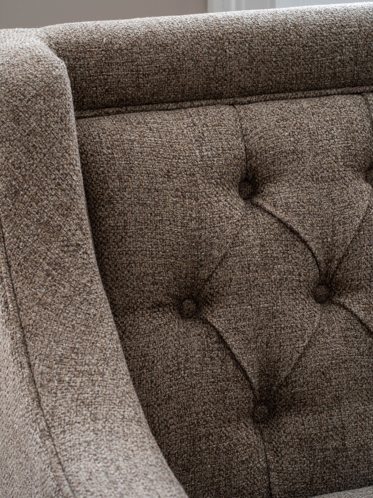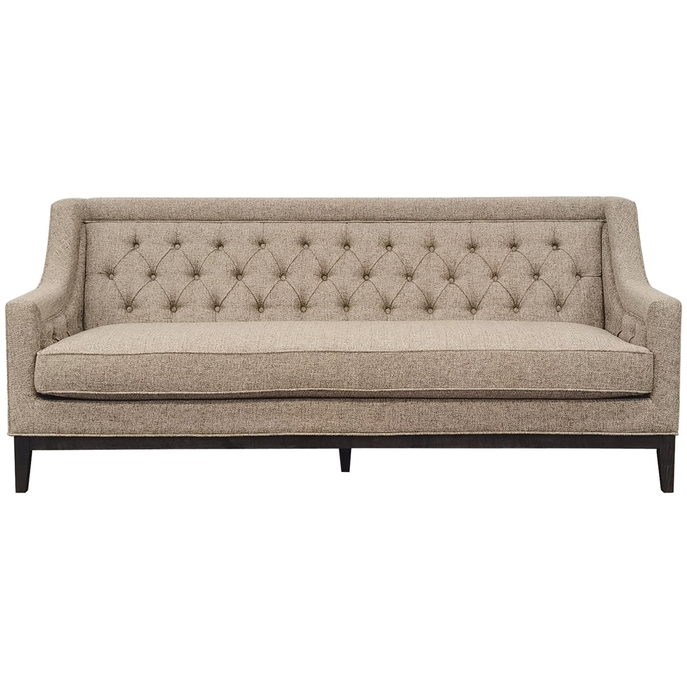 It masterfully combines sleek, sharp lines with the soft allure of inviting curves, creating a space where rest and relaxation are instinctive. Upholstered in textured dark taupe fabric, the plush seating and backrest are enhanced with meticulous button-tufting and refined piped detailing, embodying sophistication. The sofa is gracefully poised on black tapered wooden legs, which not only provide robust stability but also contribute to its stylish profile.
