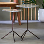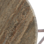 Perched upon a unique, claw-like tripod base, these tables exude an intriguing aesthetic while offering robust stability. An elegant dark bronze finish highlights their design, radiating a luxurious warmth to infuse your space. The round brown travertine tops lend a touch of natural elegance, enhancing the overall charm. Comprising a larger table and a smaller one, these versatile pieces can be used together or separately to cater to your needs.