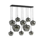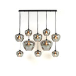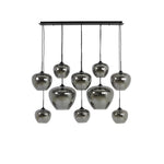 Originating from a sleek, matt black fixture, this lamp captivates with ten rounded smoked glass shades that hang at various heights to create a visually engaging display. The alternating heights add a layer of depth and dynamism, while the glass shades diffuse the light to create a soft, inviting ambience.