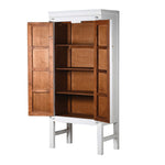 Standing on a pair of H-shaped legs, this lovely cabinet is made out of durable pine and treated to a smooth white finish for an elegant gleam. It features beautiful, brushed brass detail on the front, highlighted by two ornate handles. Behind its two doors is plenty of spacious shelving for all of your storage needs – perfect for books, drinks, or even just general clutter.