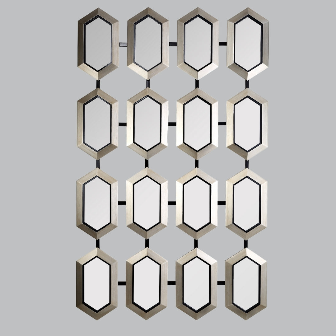 Inspired by mid-century and Art Deco design, its multi-faceted layout features interlocking hexagonal frames, each holding an individual mirror. Arranged in a structured grid, the composition evokes architectural precision and timeless symmetry whilst the champagne silver finish adds a touch of vintage glamour and refined elegance.