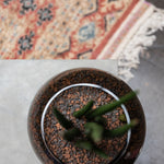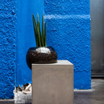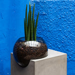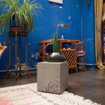 Crafted from solid fibre concrete, its geometric form is enhanced by intricate side patterns, offering both visual texture and artistic appeal. A unique blown glass bowl rests atop the cube, serving as a versatile feature—perfect as a plant vivarium, a stylish sweet bowl, or even a drink cooler.