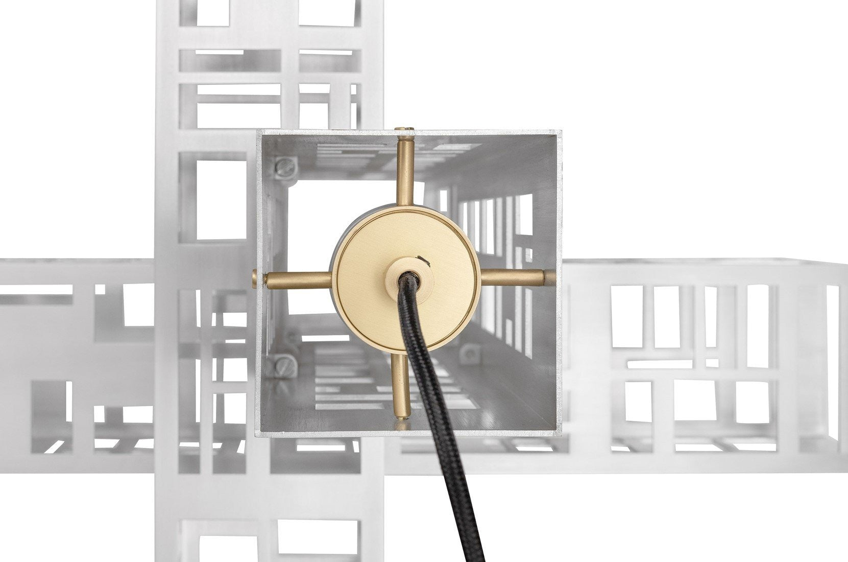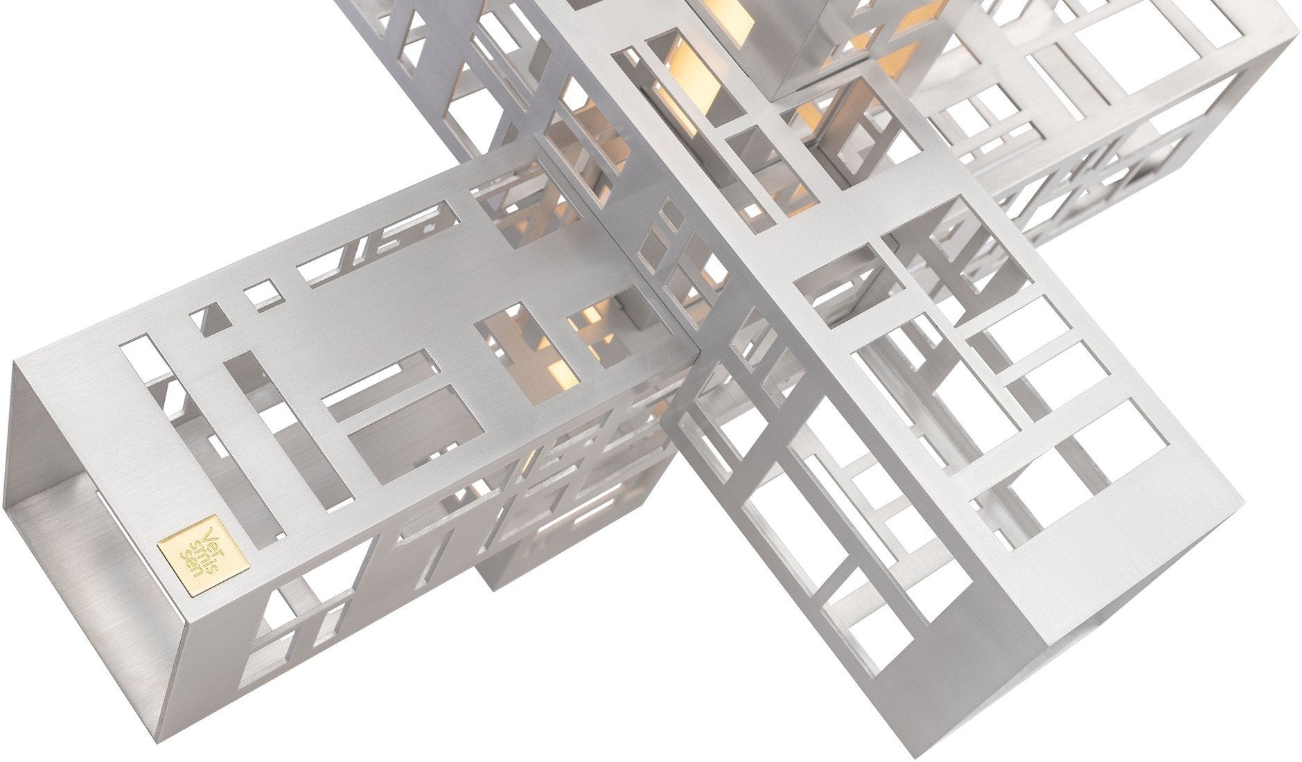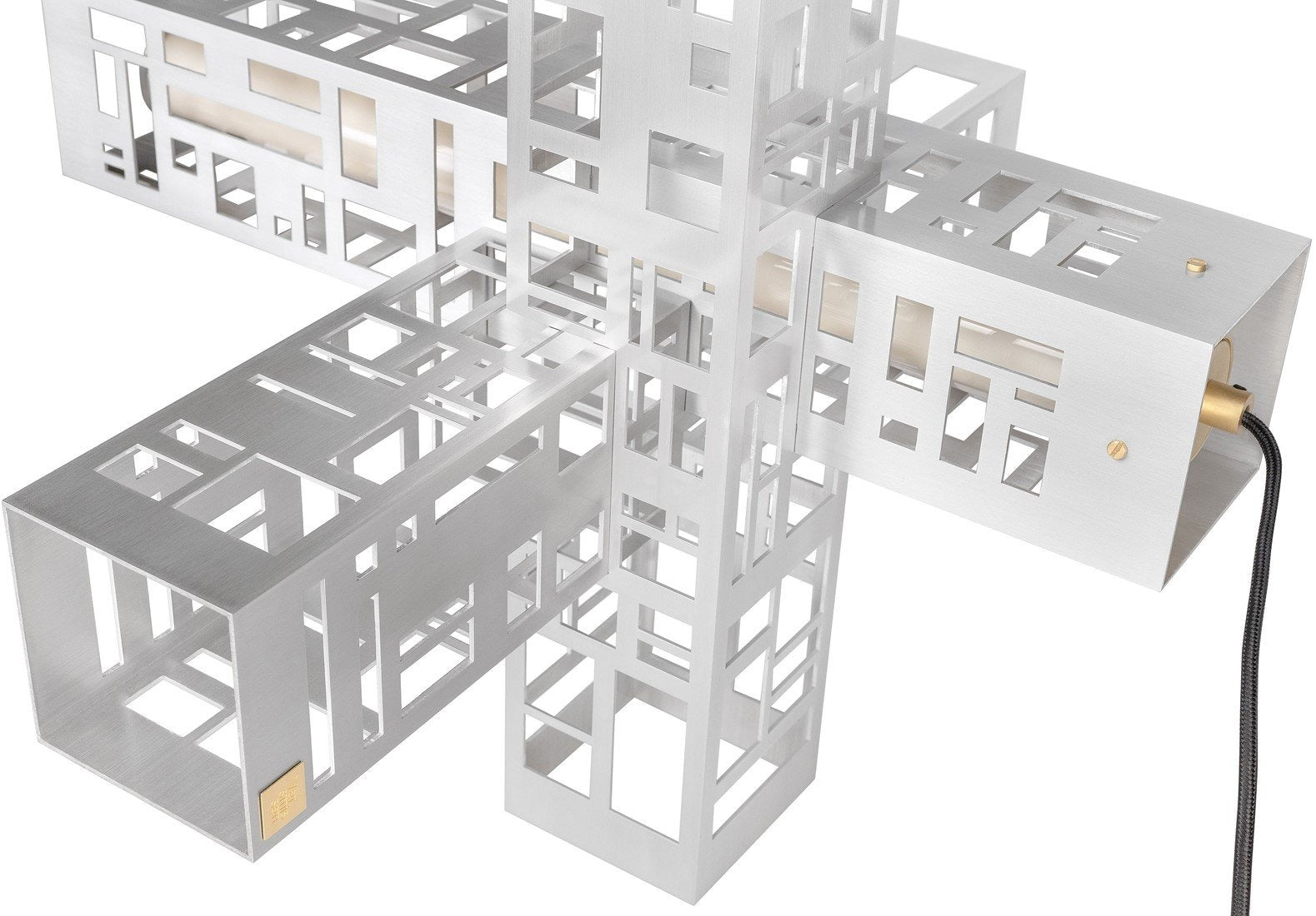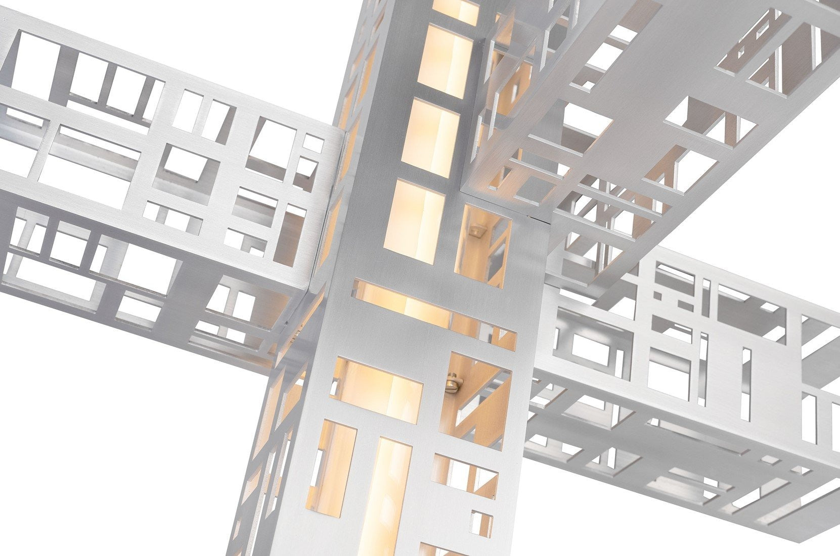 Crafted from solid aluminium with a brushed finish, its intersecting design and lattice-style structure create an architectural feel reminiscent of cutting-edge skyscrapers. An integrated LED strip illuminates through the intricate cut-outs, casting a striking and bright glow that transforms your space.