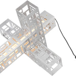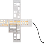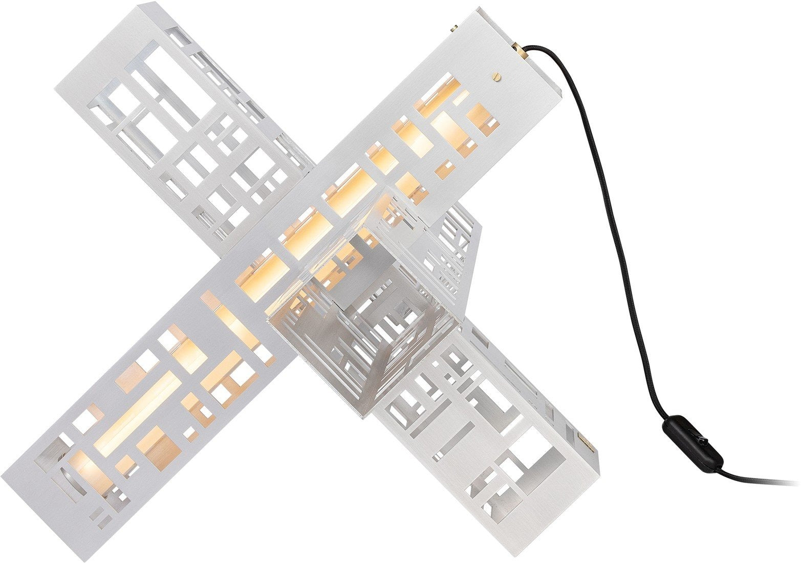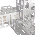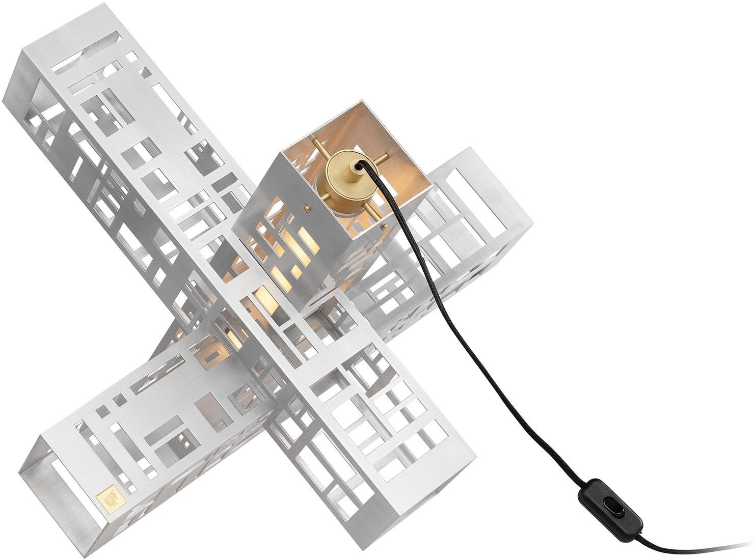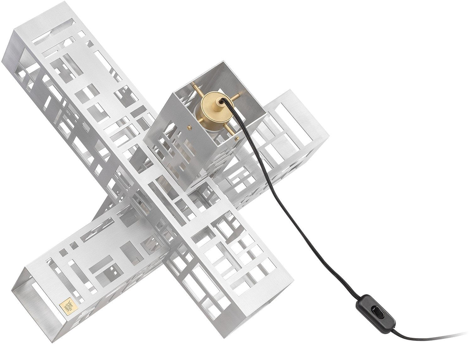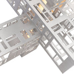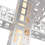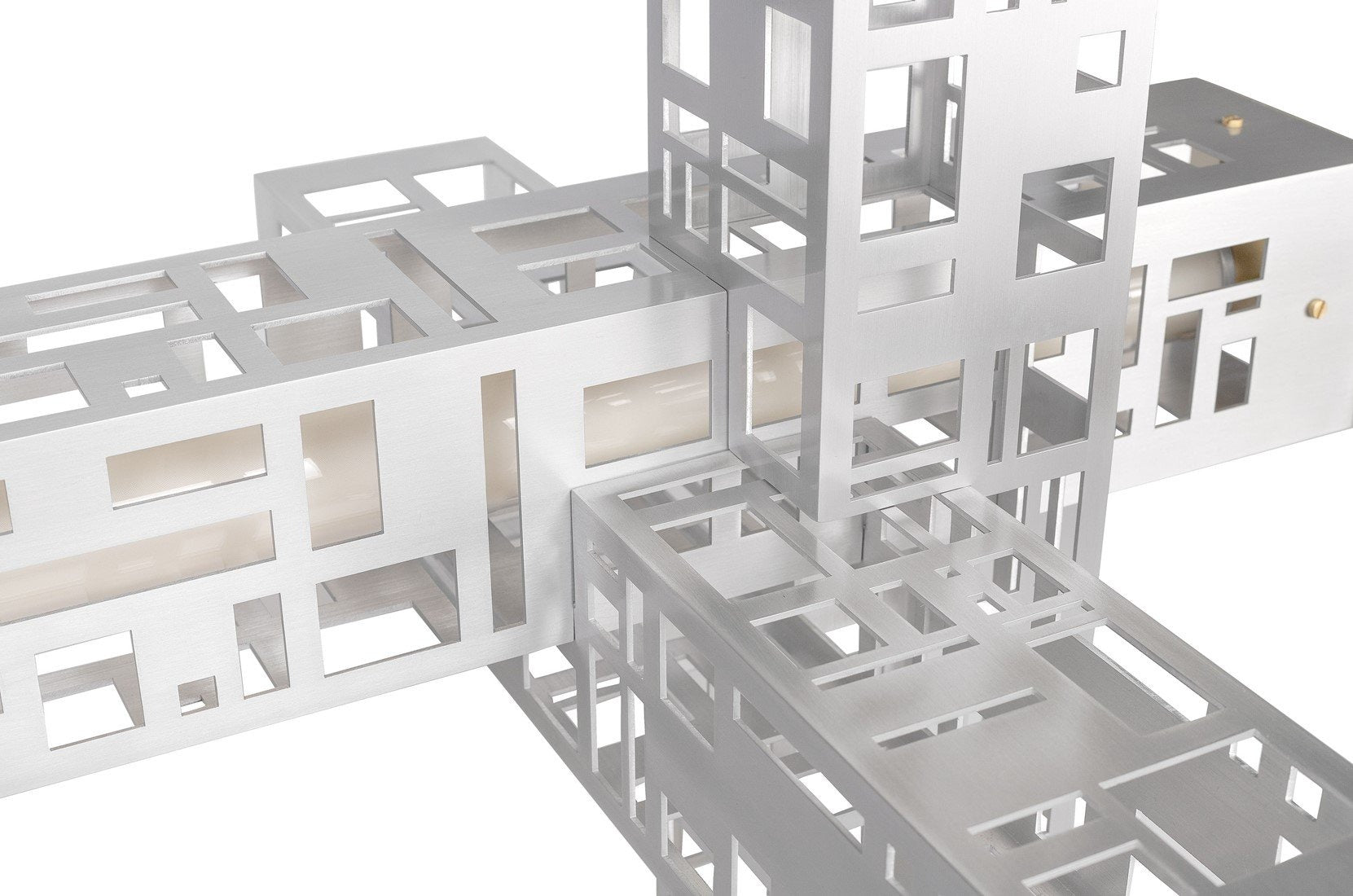 Crafted from solid aluminium with a brushed finish, its intersecting design and lattice-style structure create an architectural feel reminiscent of cutting-edge skyscrapers. An integrated LED strip illuminates through the intricate cut-outs, casting a striking and bright glow that transforms your space.