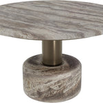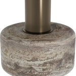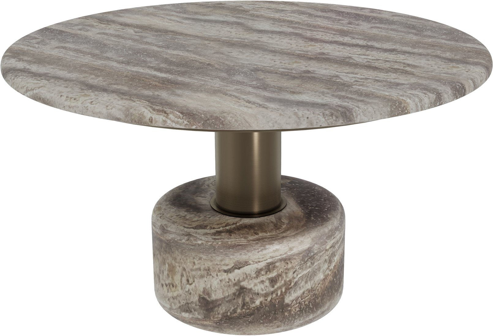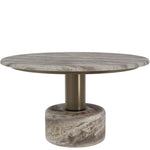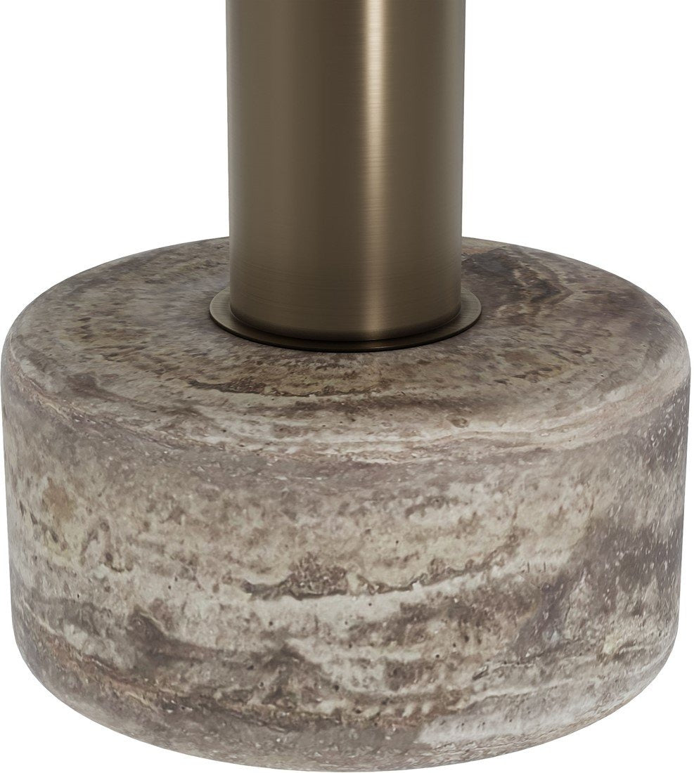 Boasting a grey travertine top and base, this table exudes timeless elegance while offering robust durability. The brushed bronze column sandwiched between adds an industrial touch, harmonising perfectly with the natural stone for a look that’s both striking and refined.