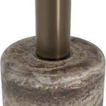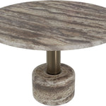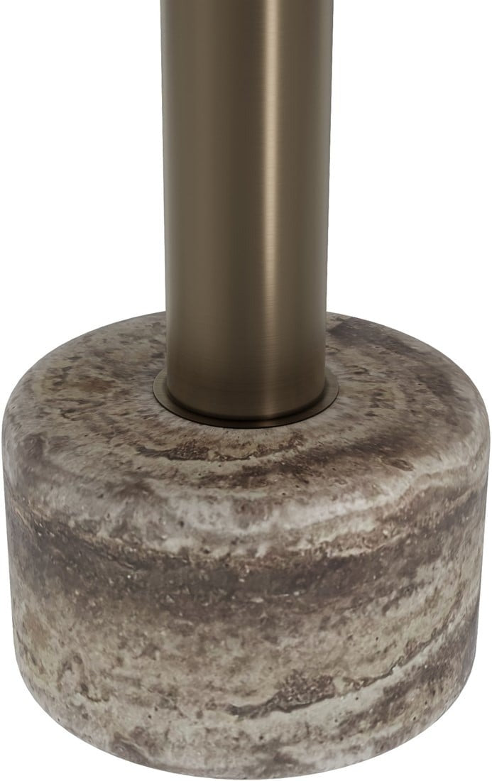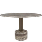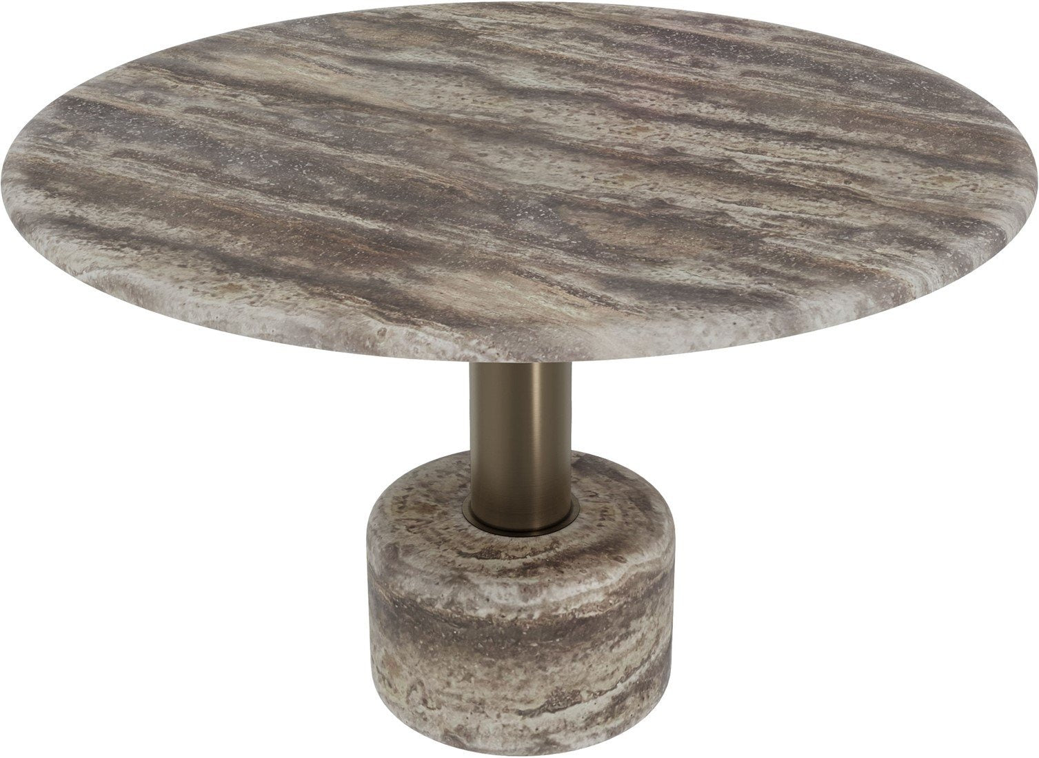 Crafted with meticulous attention to detail, its top and base are made from grey travertine, reinforced with a concealed aluminium honeycomb structure for exceptional strength and durability. A brushed bronze pedestal connects the two, lending a modern, industrial edge that perfectly complements the table’s natural stone elements.