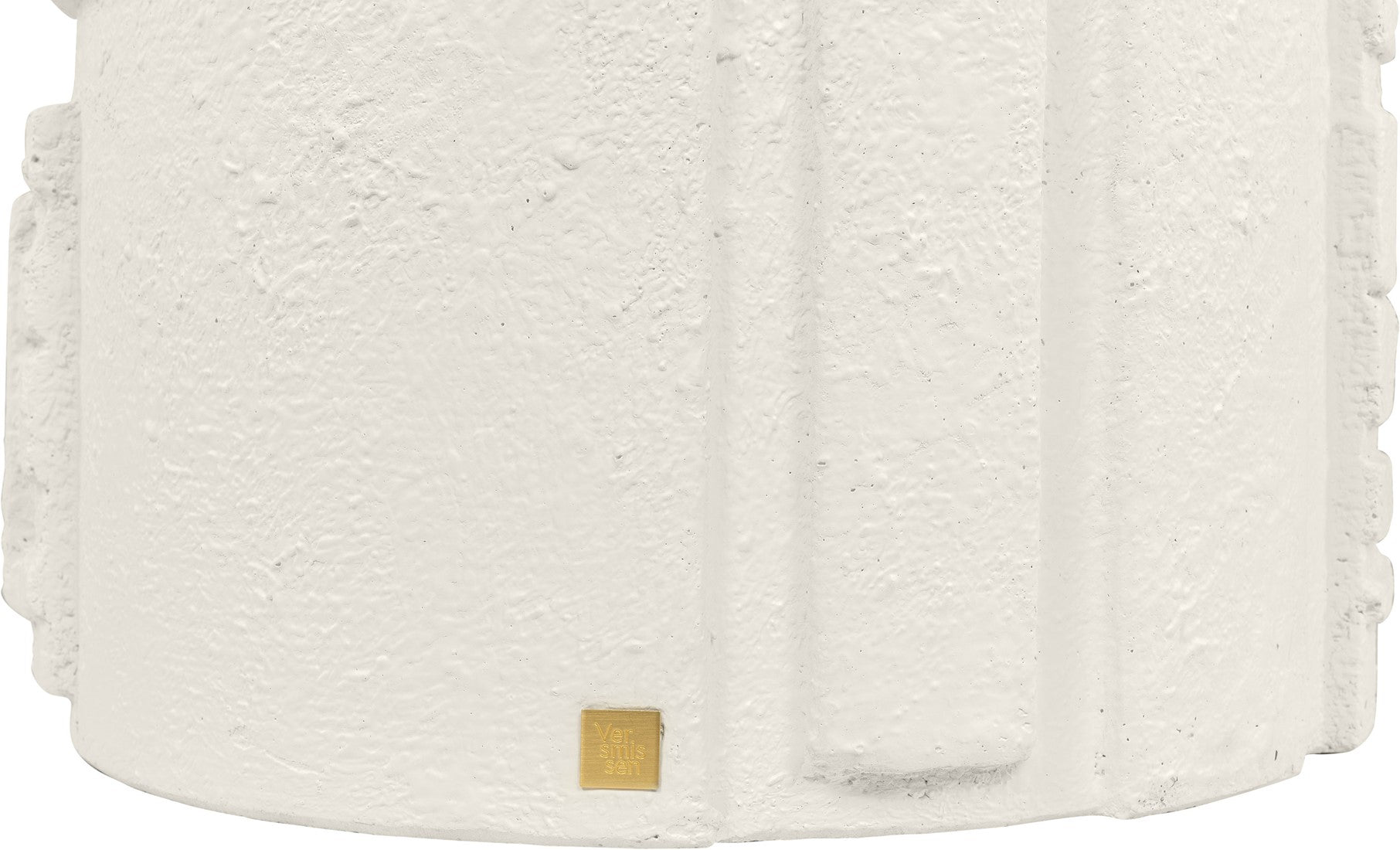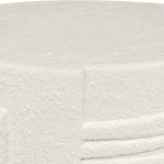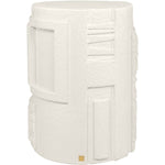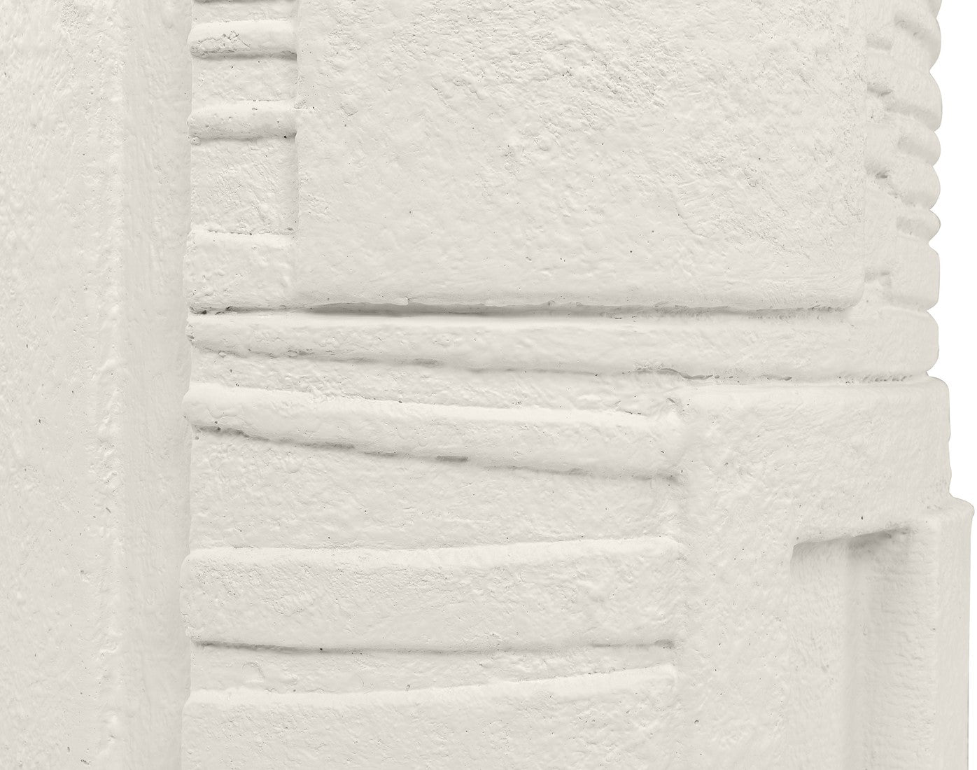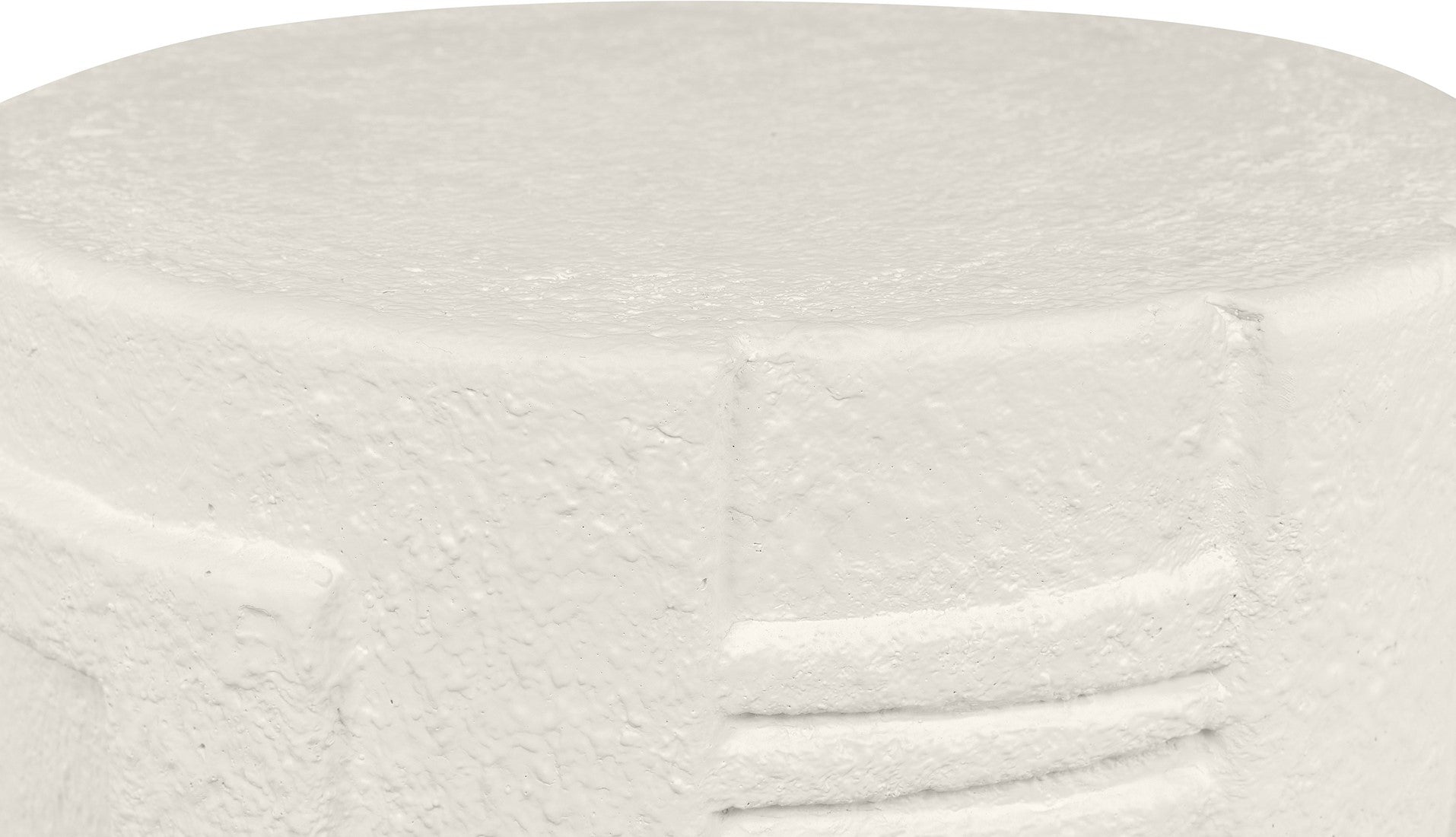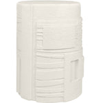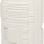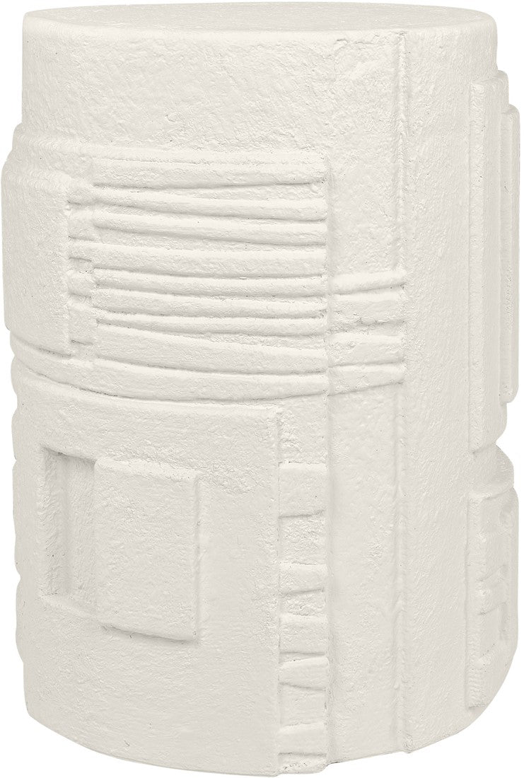 Its body is crafted from Glassfibre Reinforced Concrete, ensuring durability, resilience and an intriguing visual presence. With its striking drum-shaped design and appealing white finish, it boasts intricate detailing – a network of subtle indents and raised sections that convey a captivating, hand-carved illusion.