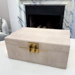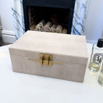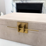 Each box is wrapped in ivory faux leather and features gleaming brass crossbar handles, adding a sophisticated touch. Versatile in design, these boxes are ideal as jewellery storage in the bedroom, a chic solution for organising remotes in the living room, or a stylish desk tidy in an office.
