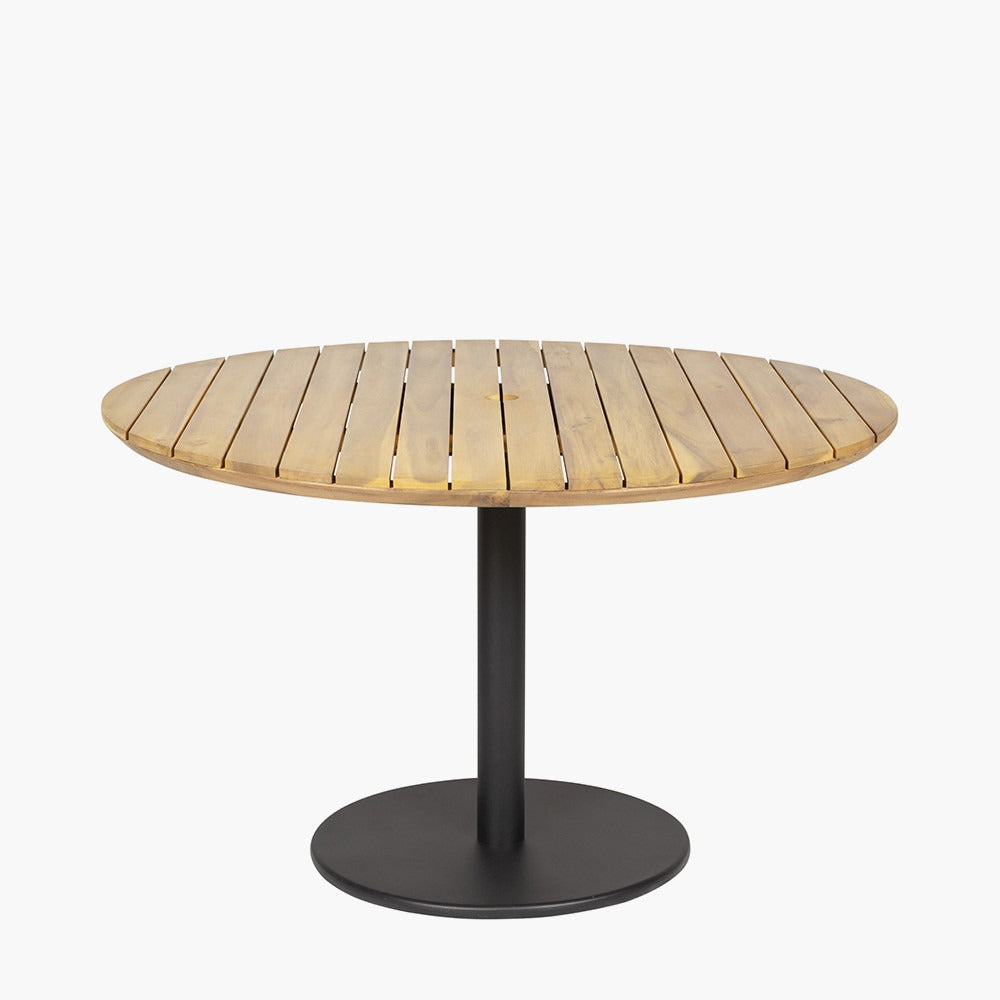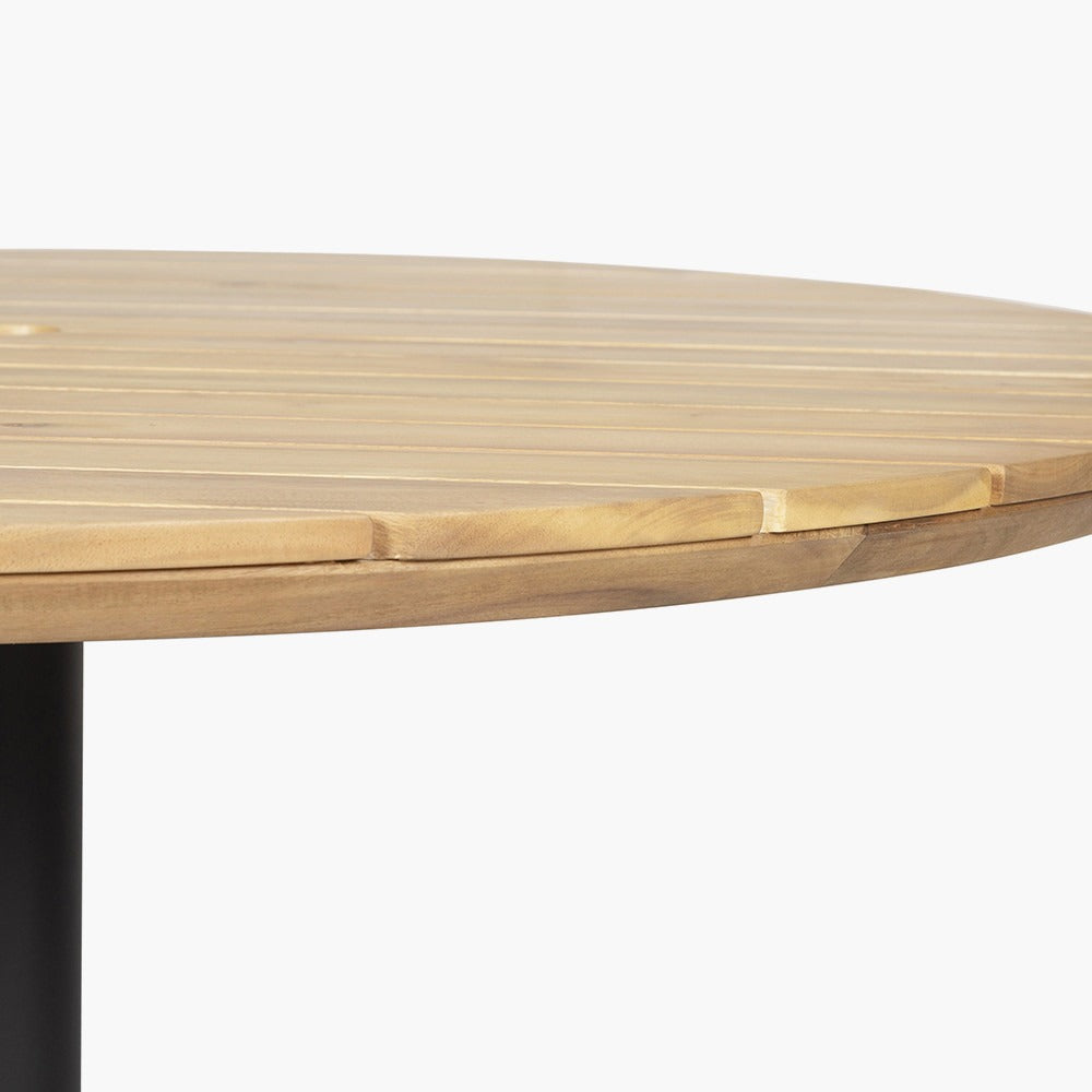 Designed for four, this elegant set includes a round dining table with a black powder-coated aluminium base and a slatted teak-effect acacia wood top with a central parasol hole. Four matching chairs feature a black polyrope weave, blending natural texture with a rustic-inspired aesthetic that feels warm and inviting.