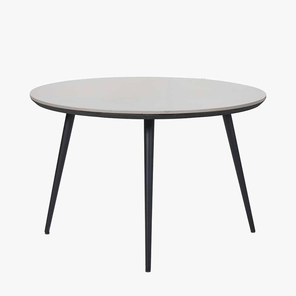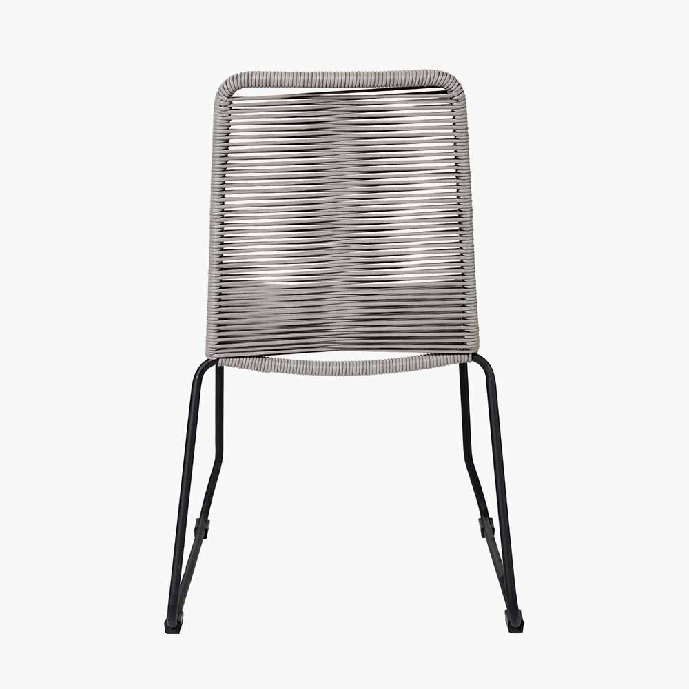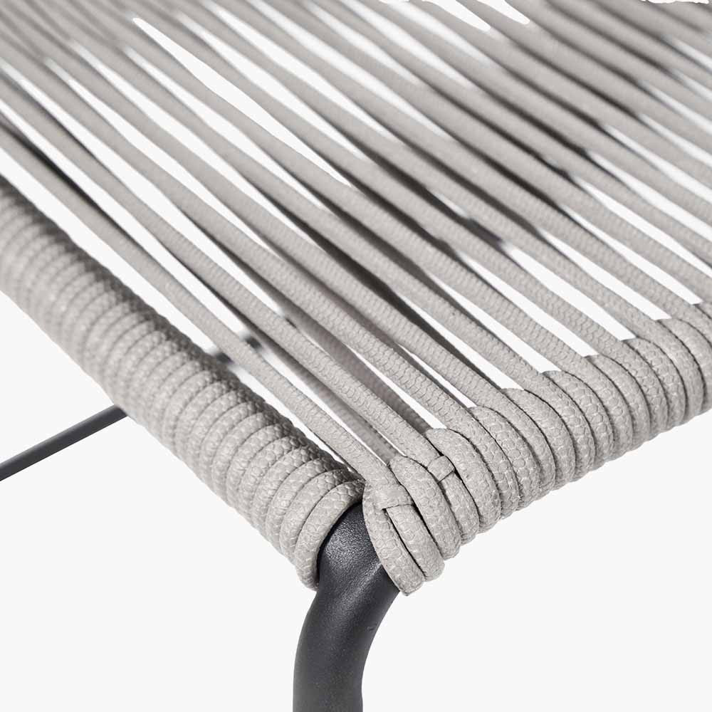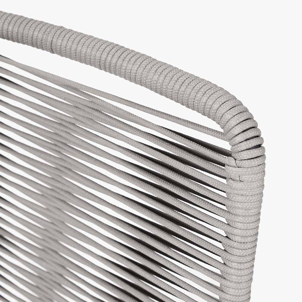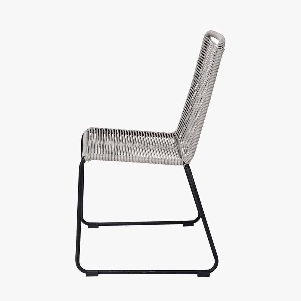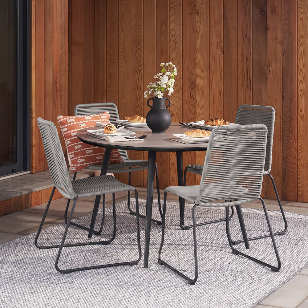 The round table features a smooth grey stone composite top that’s both weather-resistant and easy to clean, resting on slim, black powder-coated legs for a clean, contemporary finish. Four matching chairs complete the look, crafted from sturdy metal and woven mink polyrope for a comfortable yet breathable seat.