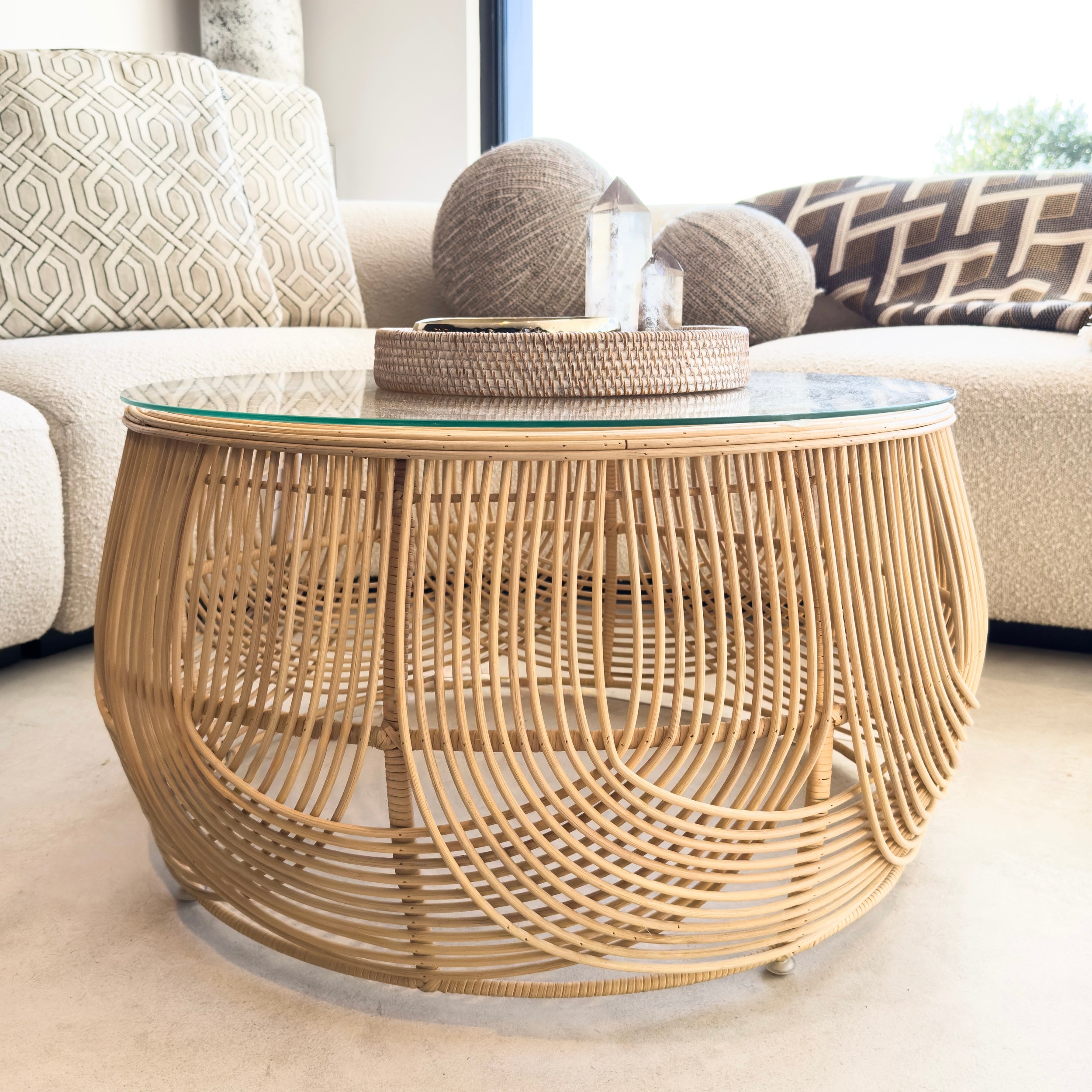 Featuring an intricate, woven rattan base with organic curves and a smooth glass top, this table combines airy, bohemian style with functional design. The clear glass top provides a sleek surface for decor or entertaining while showcasing the beautiful rattan pattern underneath.