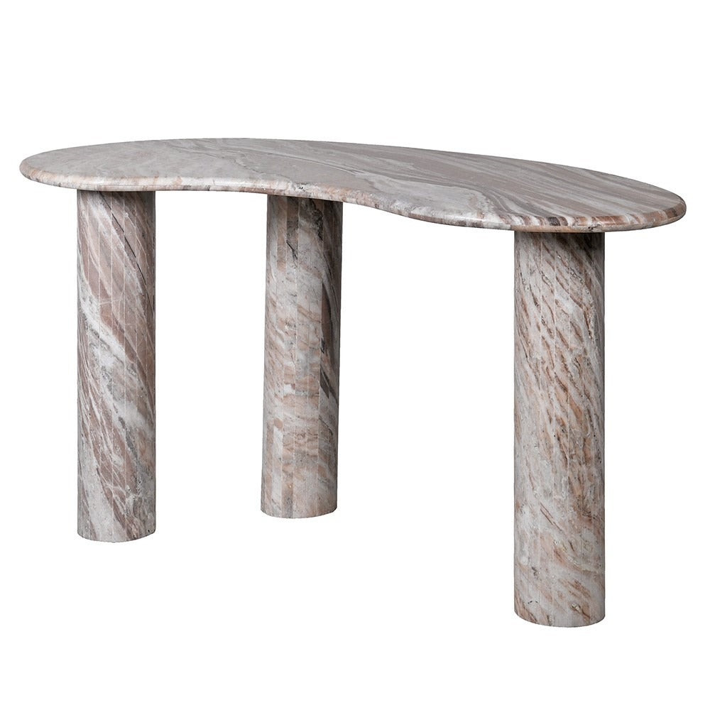 Crafted from exquisite marble, it showcases rich earthy tones and intricate natural veining that make every piece unique. Three solid column legs support an organically shaped top, providing generous space for your laptop, notes, and essentials while exuding sculptural elegance. It brings an instant sense of refinement and luxury to any room.