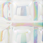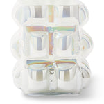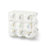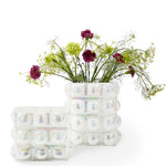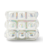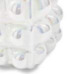 Crafted from 30% white recycled glass, its bold, three-dimensional design inspired by bubble wrap showcases bulbous orbs that catch the eye from every angle. The lustrous finish shimmers with a subtle rainbow effect, creating an ethereal quality that shifts beautifully with changing light.