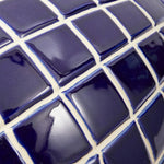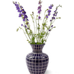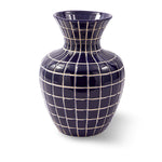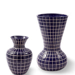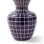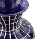 Crafted from deep blue ceramic, its curvaceous silhouette features a bold bulbous base that tapers elegantly into a flared neck, creating a dynamic yet harmonious form. Hand-drawn white lines form a striking grid-like pattern, offering a dramatic contrast against the rich blue glaze for a bold pop of colour.
