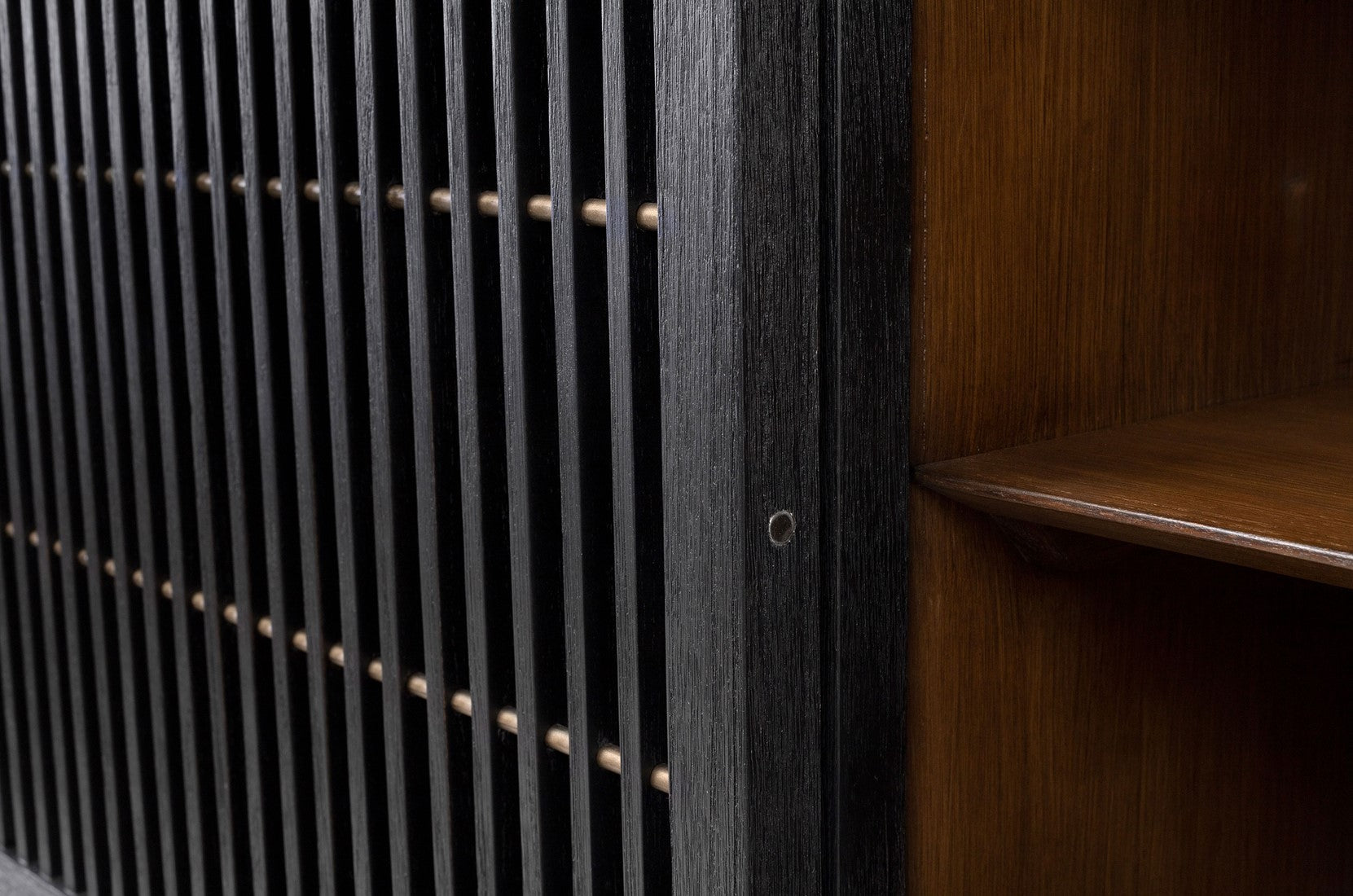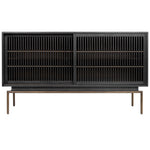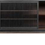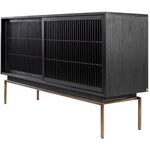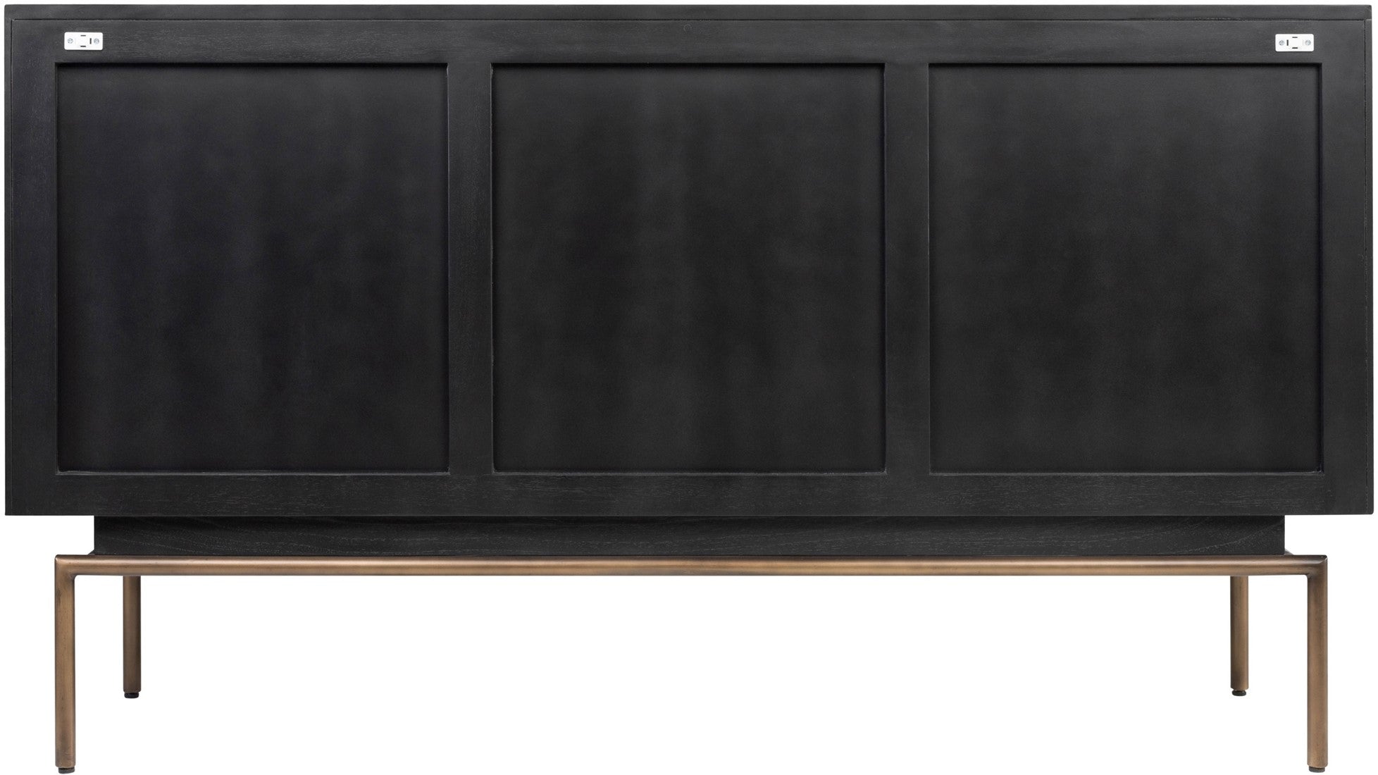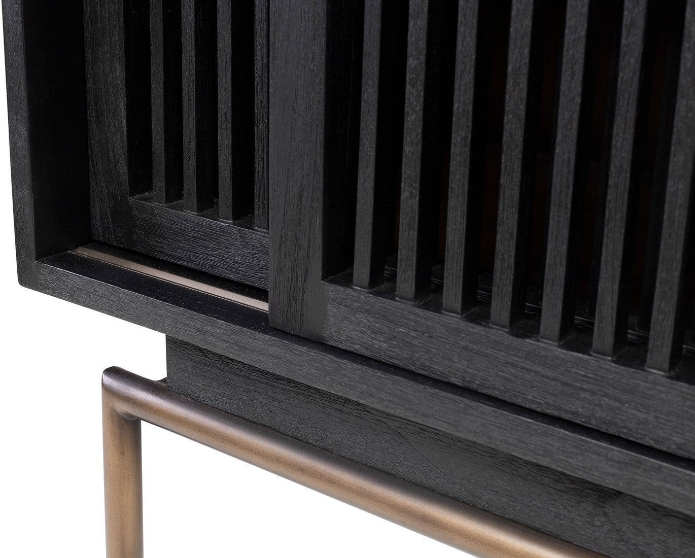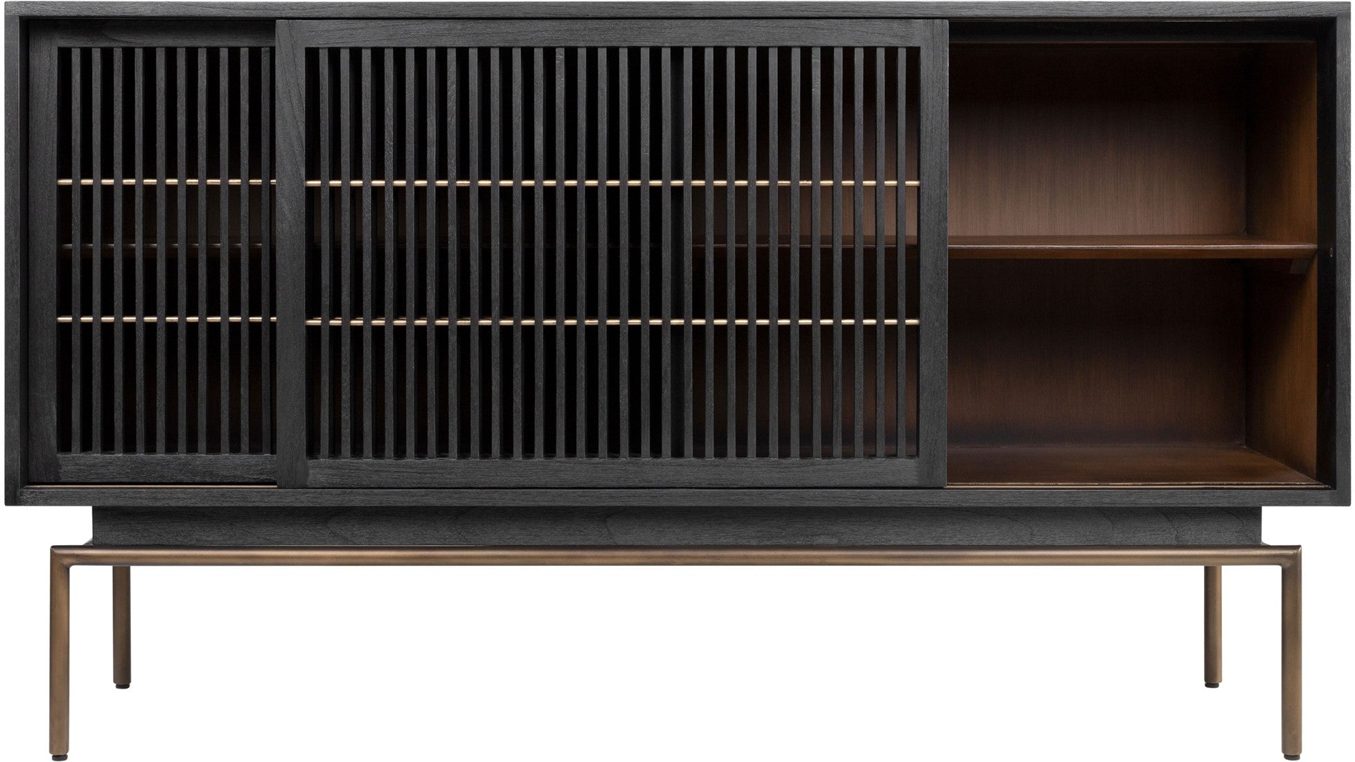 Crafted from rich black mindi wood, it embodies strength, sophistication and durability, making it a bold choice for your space. The sliding doors, adorned with a slatted design, reveal a thoughtfully shelved interior that provides ample storage for board games, paperwork, or any other items you wish to tuck away. The top surface of this sideboard serves as the perfect platform for showcasing decorative items, floral displays, or cherished photographs.