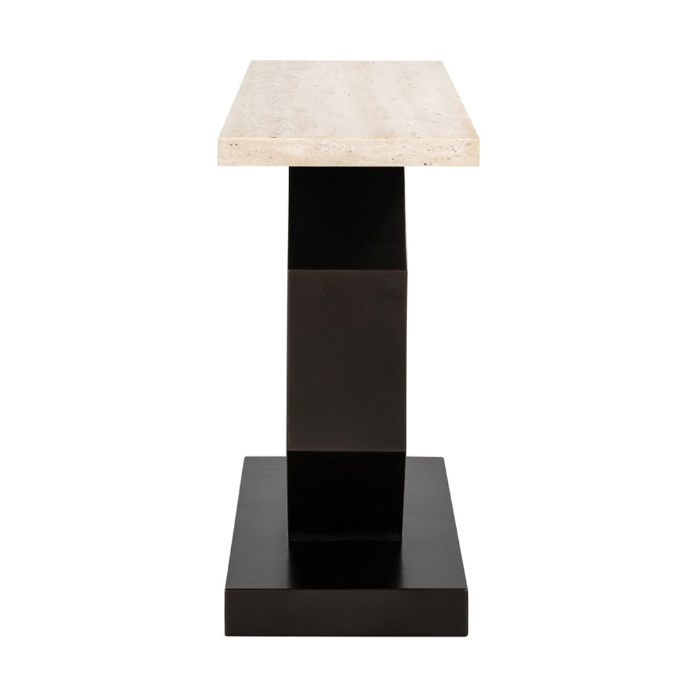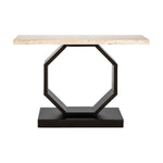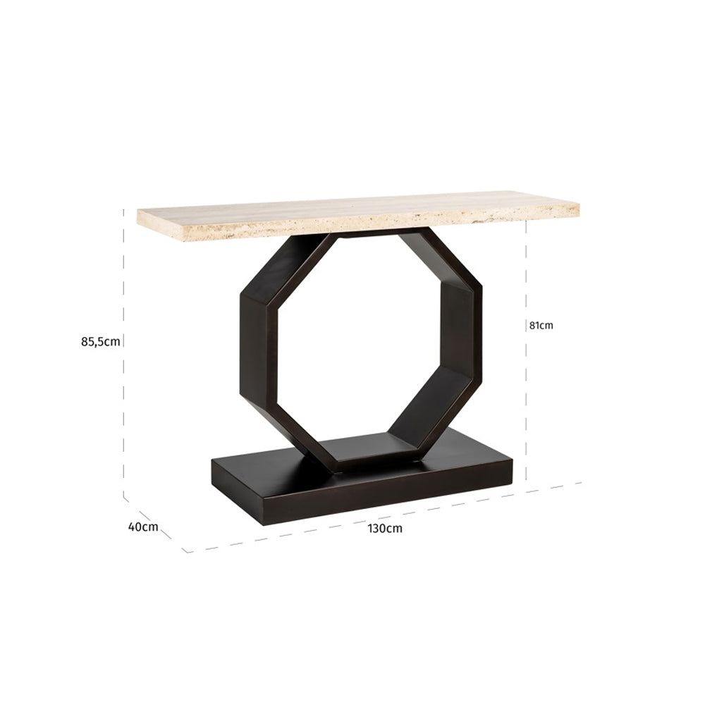 Presented in dark bronze iron, its quirky octagonal silhouette sits atop an sleek rectangular base. The clean lines and sharp angles are topped by a rectangular travertine surface which adds an earthy, elegant touch to your space. It is ideal for displaying ornaments or as a functional addition to your hallway, so it is a versatile choice.