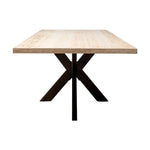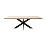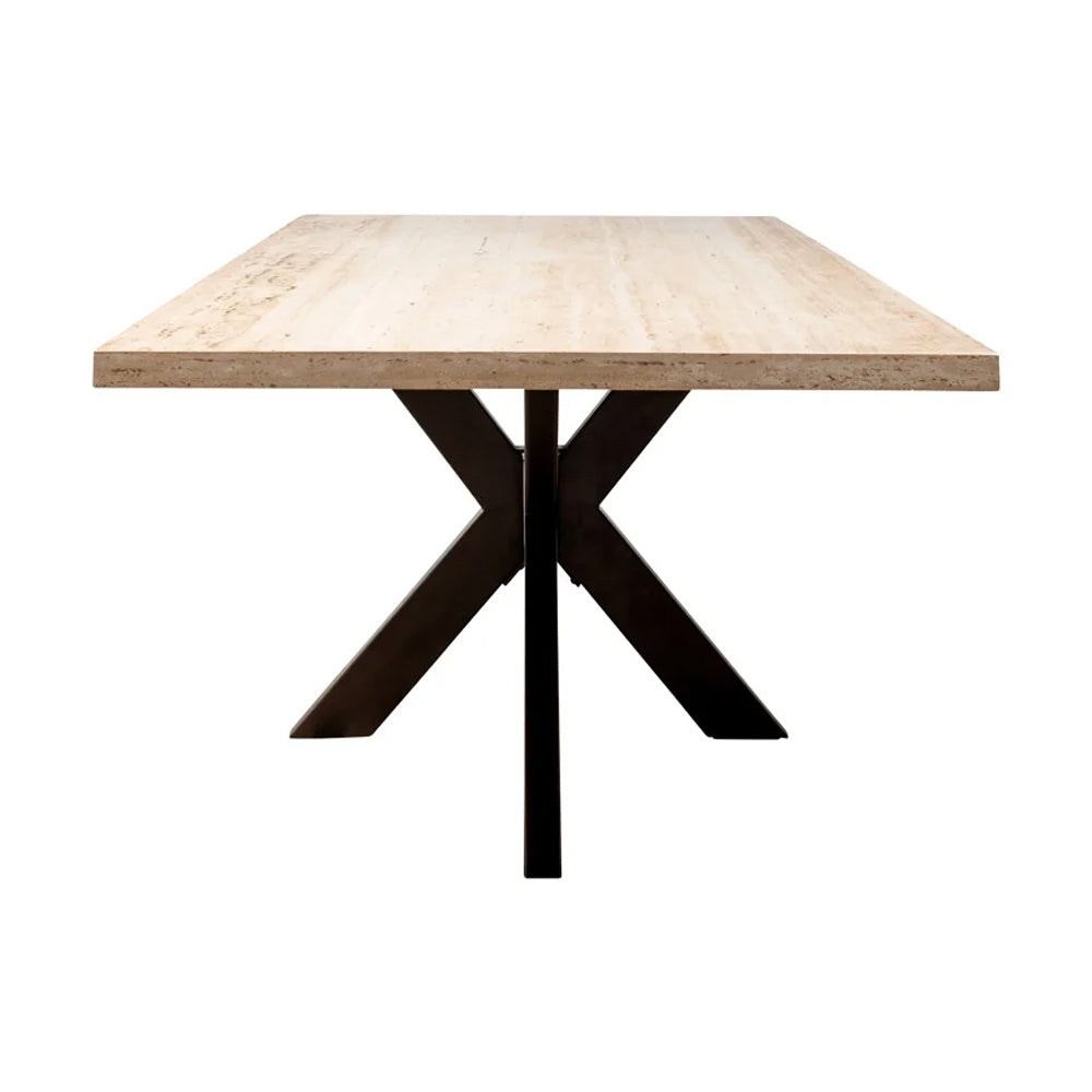 With a rectangular, sand-coloured travertine top and a dark bronze X-shaped iron frame, it radiates elegance throughout your space. Understated luxury and a spacious surface make it ideal for family meals and dinner parties alike, ensuring this table will suit your needs perfectly.