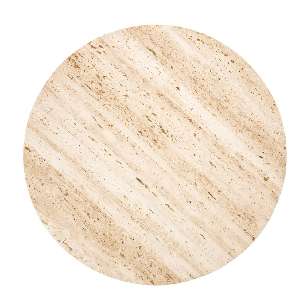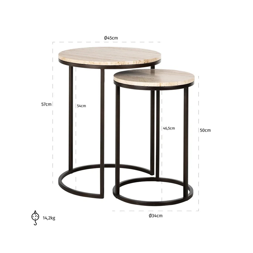 Designed with sleek iron frames, each table boast sharp lines, smooth curves, and a rich dark bronze finish. A sand-coloured travertine top completes each table, introducing natural elegance into any space. Thanks to their nested design, they can be used together for a coordinated look, or spread out to optimize your space, providing both functionality and aesthetic charm.