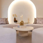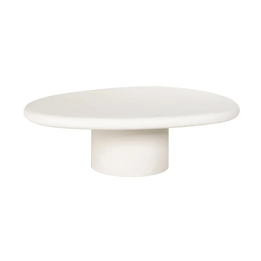 Echoing the charm of nature, its organically shaped round tabletop is complemented by a solid column base. Both are expertly crafted from wood and given a unique light eco plaster finish. Its minimalist yet captivating form is destined to stand out.