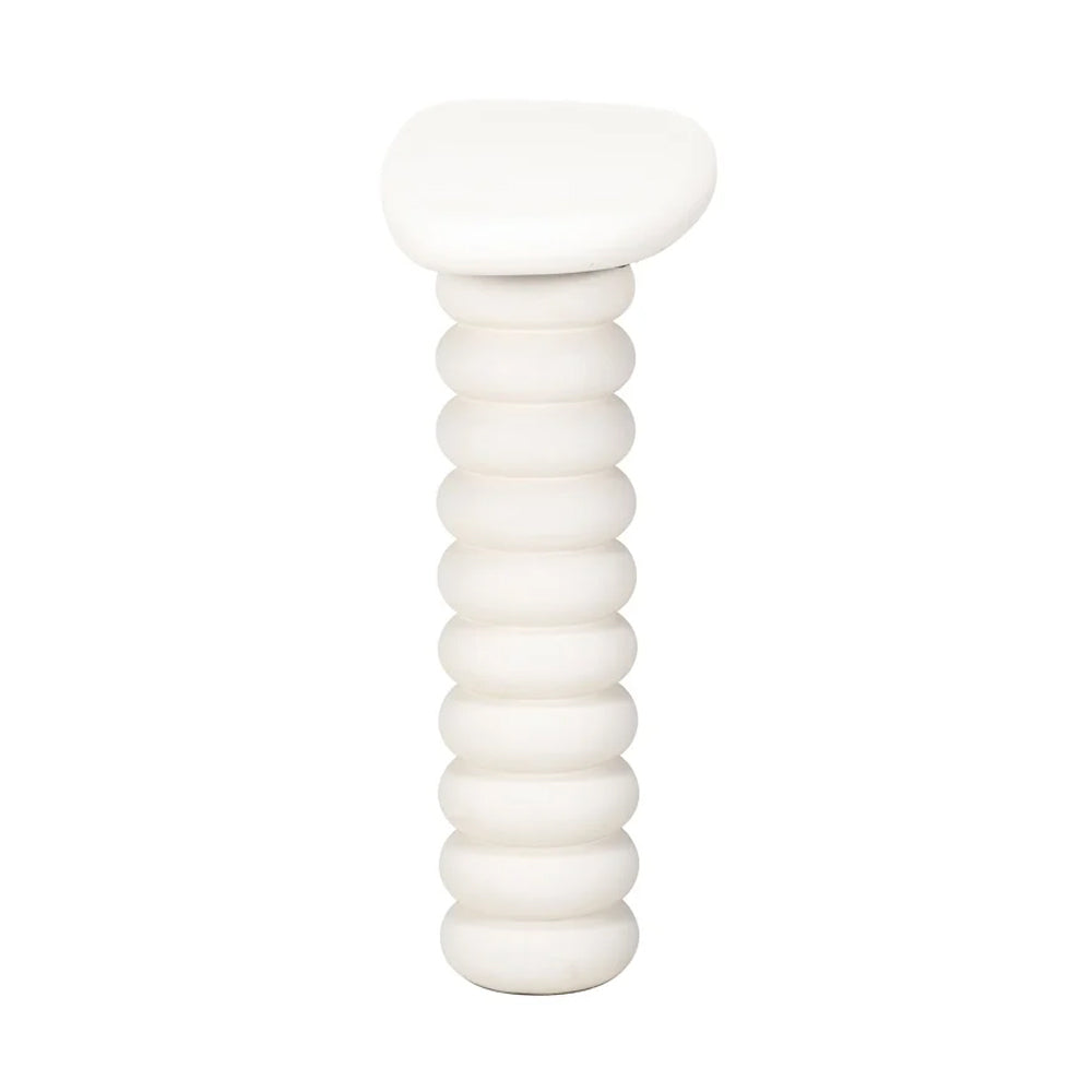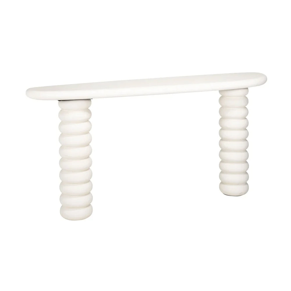 Expertly constructed from wood, its light eco plaster finish adds a unique visual appeal. The organically shaped top, borne by two whimsically twisted legs, infuses a playful flair into its streamlined design.