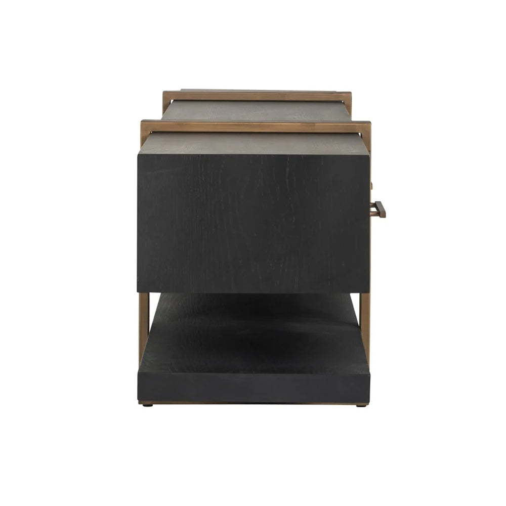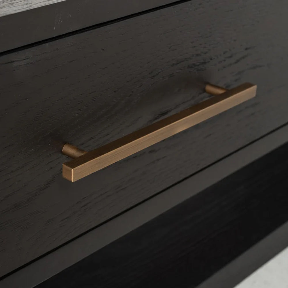 A vibrant combination of warm and dark tones allows the Cambon TV-Unit to stand out as an attractive choice in any room. Primarily crafted from beautiful oak veneer, its rich, coffee-coloured finish radiates a classy aesthetic whilst antique brass finished legs and handles add a contemporary gleam.