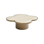 Inspired by its namesake, the table features a charming clover-shaped top with smooth, flowing curves. The beige travertine surface adds a natural sophistication, beautifully complemented by the sturdy brushed gold iron base for a piece that is both durable and elegant.
