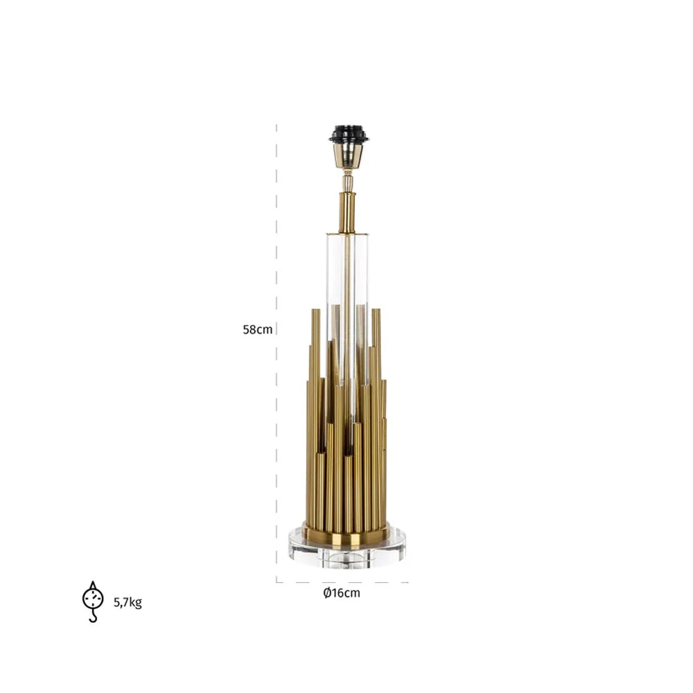 Rising from a round glass base, this lamp boasts an artful arrangement of iron rods that  extend upwards at varying heights. Finished in a warm brushed gold, these metallic accents add a touch of opulence to any space. An effortless statement piece to complete your décor, it exudes a sense of modernity and sophistication. Place it on a side table, console, or desk to create a captivating focal point.