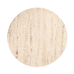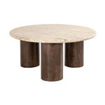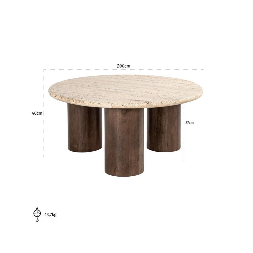 It features a round, sandy-coloured travertine tabletop which stands out as a refined centrepiece. This is paired with robust, dark mango wood pillar legs to showcase a stylish contrast of textures. Its elegant design effortlessly fits into contemporary, rustic, industrial, minimalist, or maximalist spaces, elevating them in an instant.