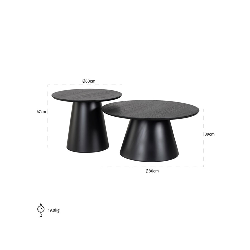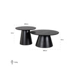 Each table features a chunky conical iron base and a sleek wooden top, embodying both sturdiness and style. Artistically finished in black, they infuse any setting with an alluring aesthetic, fitting seamlessly into both minimalist and bold interiors. You can arrange them together for a larger, unified surface or separate them to maximise your space's functionality.