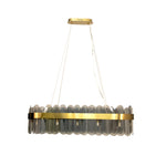 Crafted with meticulous attention to detail, its sleek metal band, fashioned from brushed gold iron, exudes an aura of sophistication. Adorning this captivating structure are a multitude of intricate glass droplets that come together to create a breathtaking display of light and beauty. This stunning light will illuminate your space with its dazzling glow, enhancing the ambience of any room.