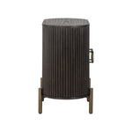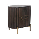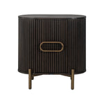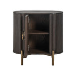 This rounded cabinet absolutely oozes strength and refinement with its dark brown tones, ridged exterior, and smooth top. The bulk of the cabinet is made from a combination of plywood and oak for a sturdy finish. Its sleek brass-finished legs and oval handles offer an opulent contrast to the hardy appearance of the rest of the unit. Inside the cabinet, there is plenty of storage space to keep your living room or bedroom free of clutter.