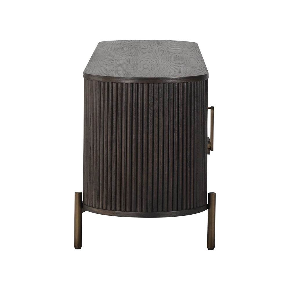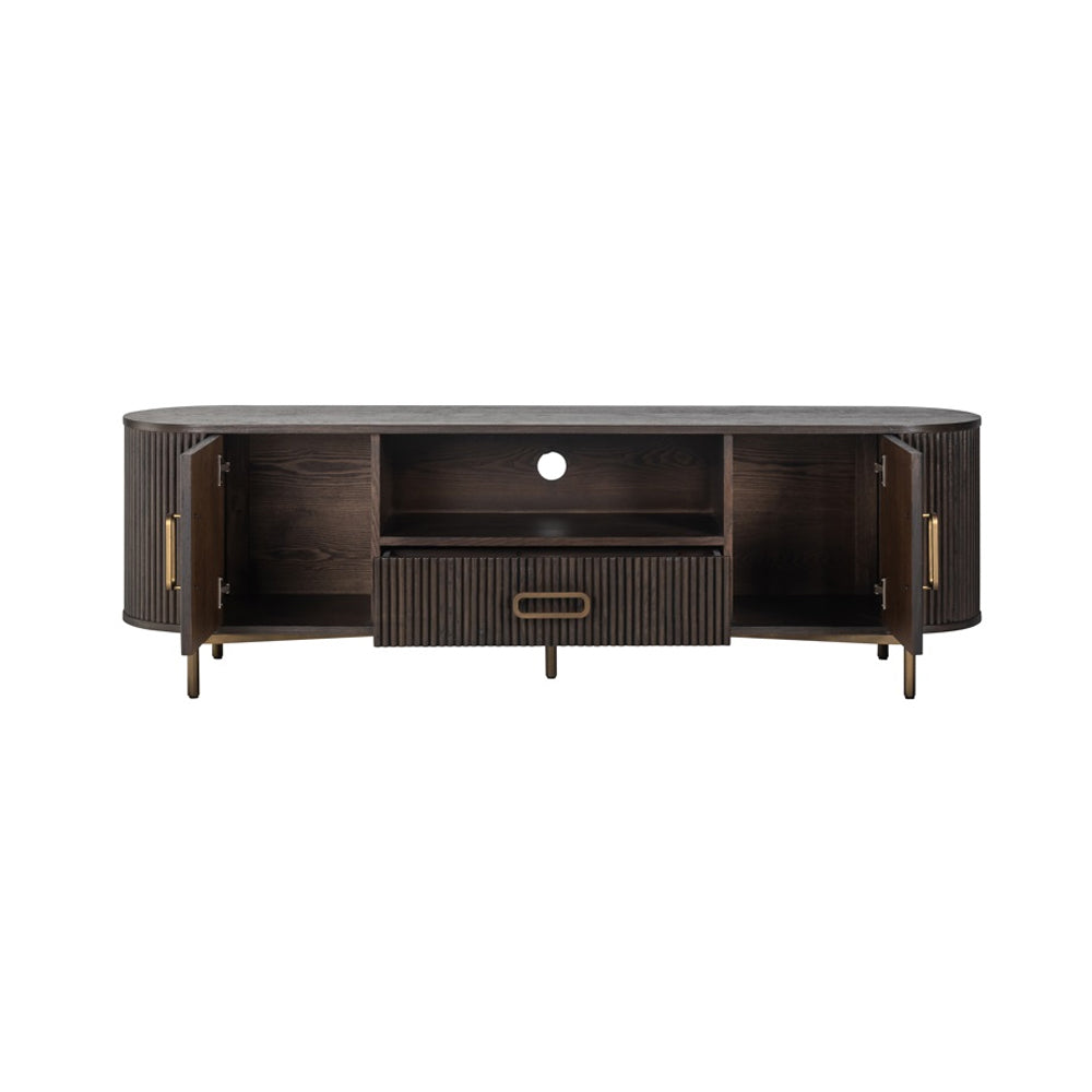 The Luxor TV Unit allows you to make the most of your space. A combination of rich, brown wood and opulent brass accents ensure a stunning result which is accentuated by its lovely, ribbed detail. It features two doors and a central drawer so there is plenty of space for your entertainment system and any DVDs or games you wish to store neatly away.