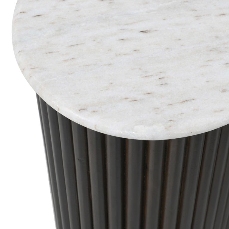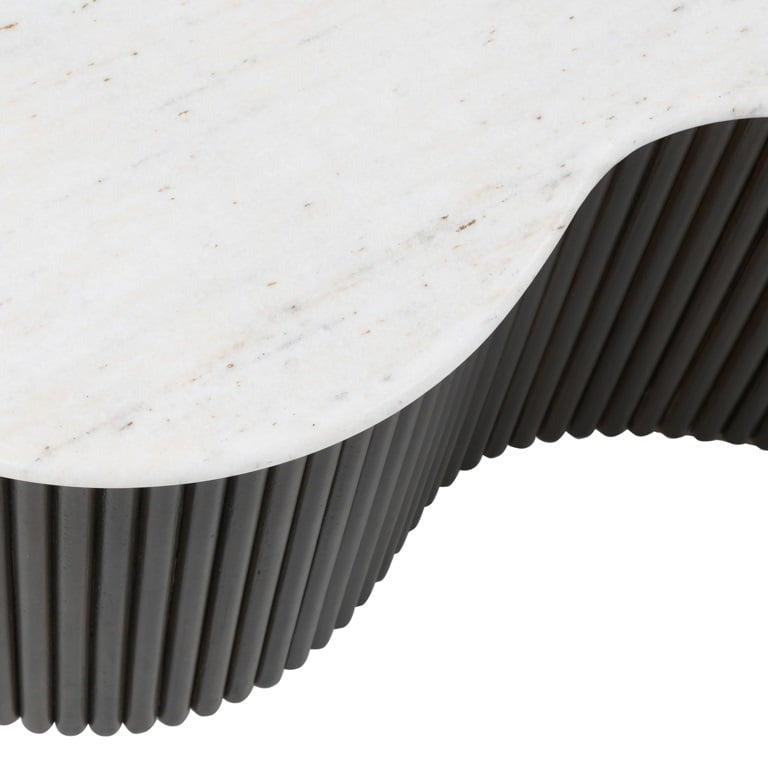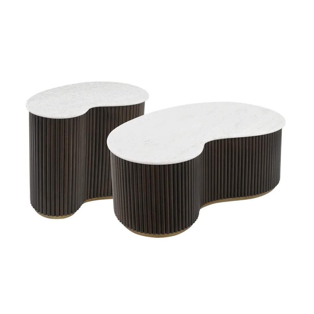 This convenient set of two tables features luxurious white marble tops, bringing both style and versatility to your living space. The ribbed mango wood bases add a rich, organic texture, beautifully enhanced by a refined brass trim. Designed with smooth, kidney-shaped silhouettes, the tables create a bold statement when paired together or offer flexibility when used separately.