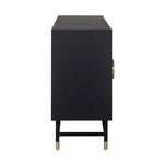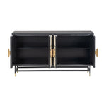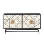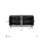 The luxurious style of the Novas Sideboard from Richmond Interiors brings elegant beauty to your space. This stylish piece is made from rich black mango wood and features sleek iron legs which support it with a degree of poise. Lined with animal bone, the front of the sideboard boasts a striking geometric pattern that allows it to stand out in any setting. It is an attractive choice with plenty of storage space hidden away behind four doors. Brass-capped feet and semi-circular handles complete the design with an opulent gleam. With an extravagant design that enriches in an instant, the Novas Sideboard will bring an excellent sense of presence to your room of choice.