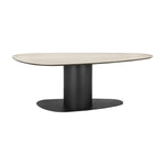 Featuring a unique pebble-shaped travertine top, this table introduces a natural, earthy element to your dining area. The smooth, curved lines of the top are beautifully complemented by a sleek black metal base, creating a modern, architectural feel.