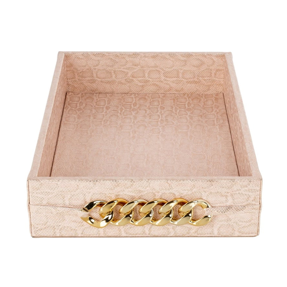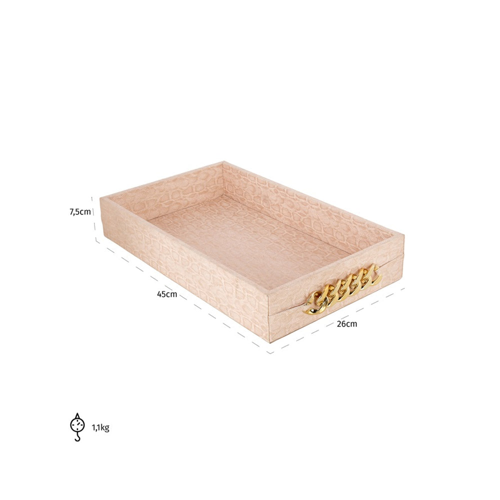 Expertly crafted, this exquisite tray boasts an elegant pink faux leather exterior that exudes a timeless allure. Gleaming link detailing at both ends of the tray enhances its visual interest. The tray is generously spacious, offering ample room to accommodate your jewellery, trinkets, or small essentials, ensuring an environment free from clutter.