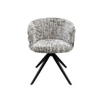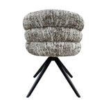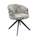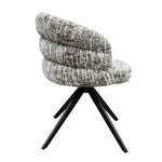 With a plush seat and a curved, cocoon-like backrest, it offers unparalleled comfort, making it a seat you’ll love sinking into. Upholstered in tactile brown omara fabric with stylish channel-stitched detailing on the back, it combines elegance with modern appeal. The splayed black metal legs add a touch of sophistication, while the built-in swivel mechanism provides effortless movement for extra convenience.