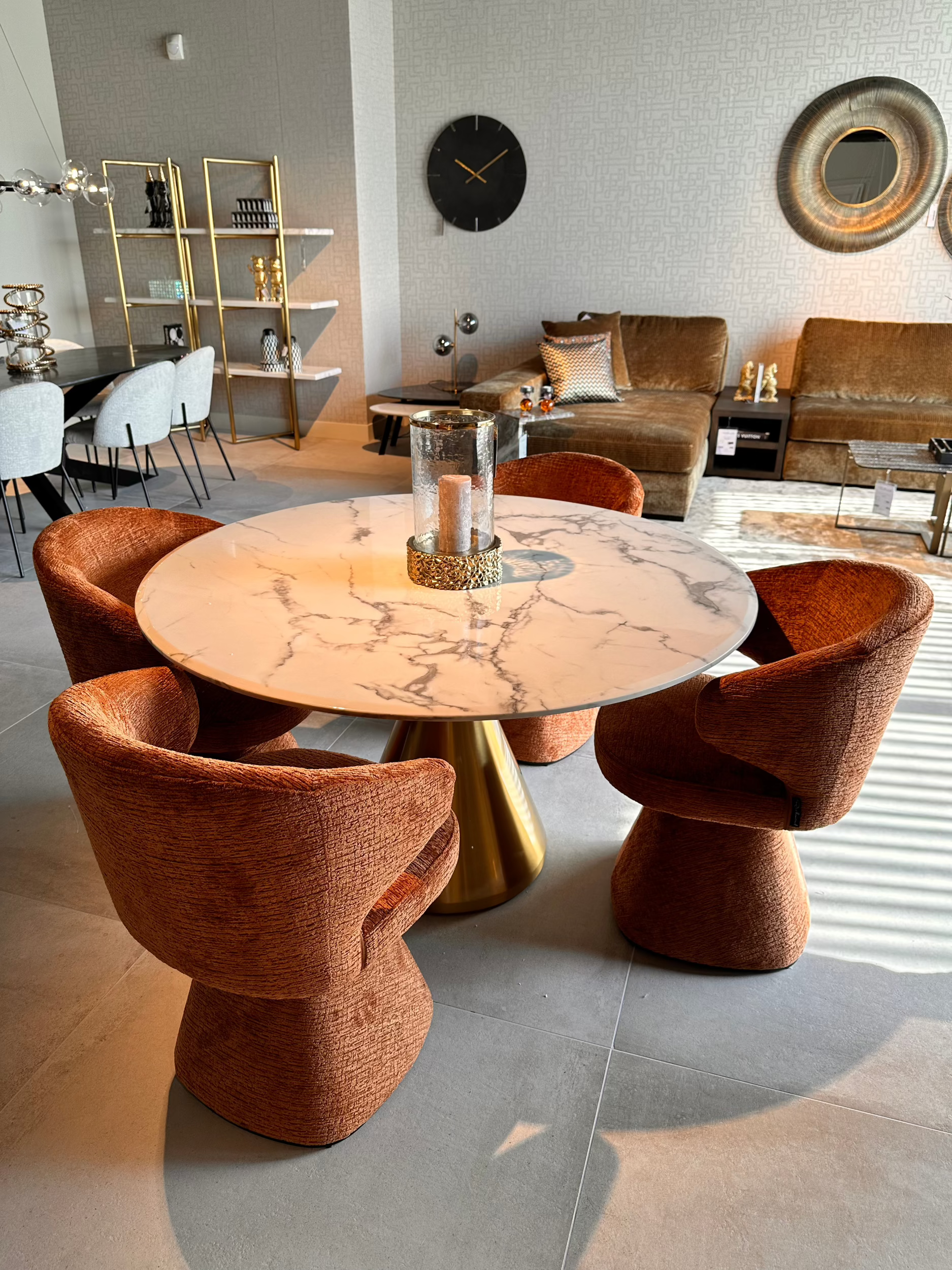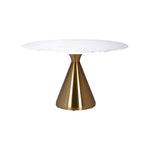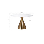 Pride of place in your dining room, the Tenille Dining Table allows you to stand out from the crowd. Standing on a conical stainless-steel base with a gleaming brass finish, the deco appeal is clear from the start. Its smooth, rounded tabletop is made from white faux marble which offers all the charm of the natural stone whilst being more resistant to scratching. Bringing an undeniable warmth to your space, the Tenille Dining Table is an exquisite beauty worthy of attention. Pair with something from our luxurious range of dining chairs for the ultimate dining experience.