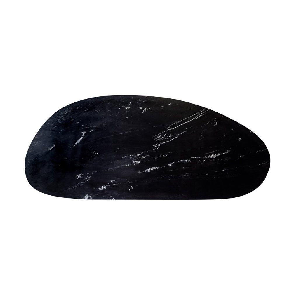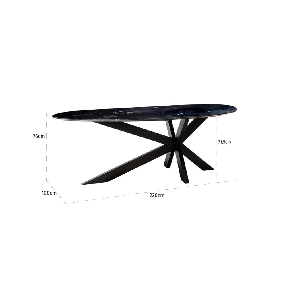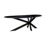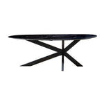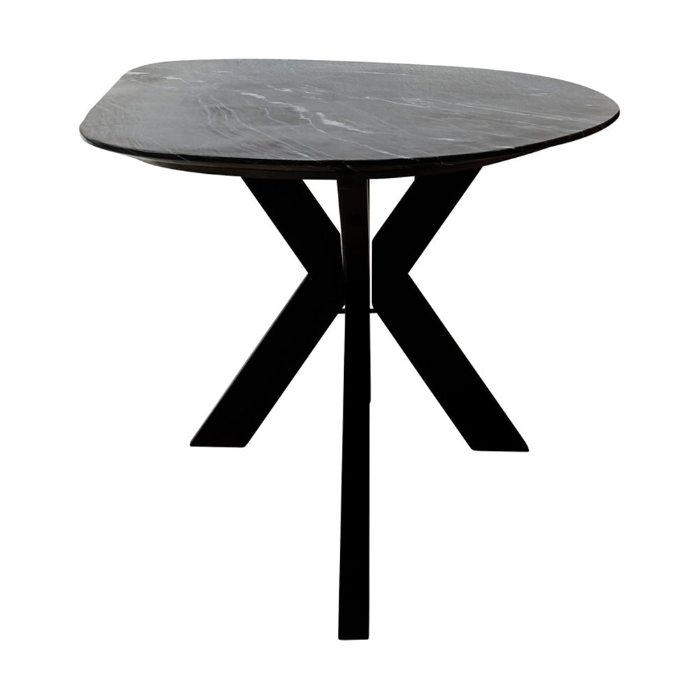 Drawing influence from both contemporary and industrial design, it features a sturdy x-shaped frame made from black iron. The highlight is a rounded tabletop made from black marble which radiates luxury through its natural veining and smooth surface. This harmonious blend of materials creates a striking contrast, making it a stunning focal point in your dining area.