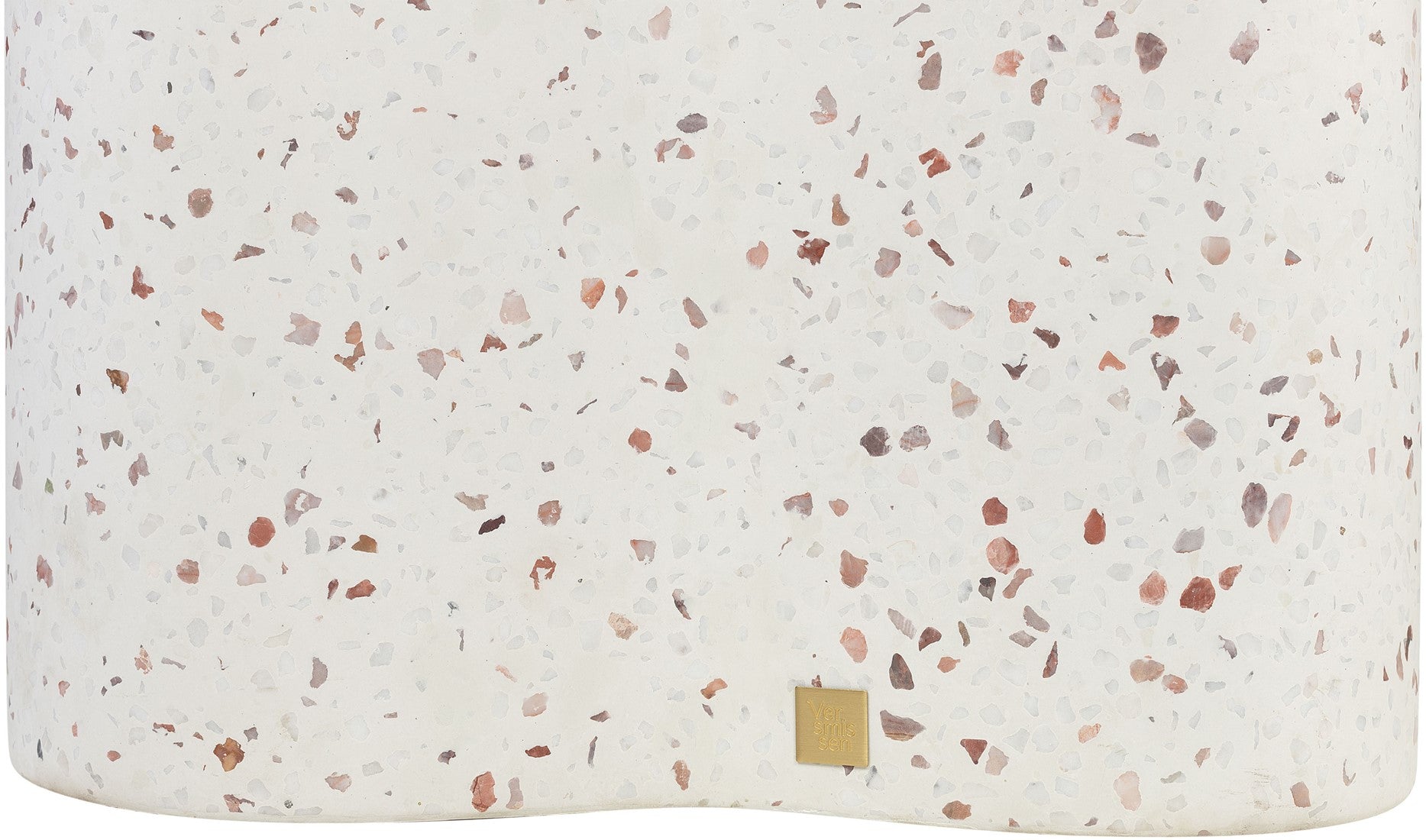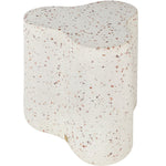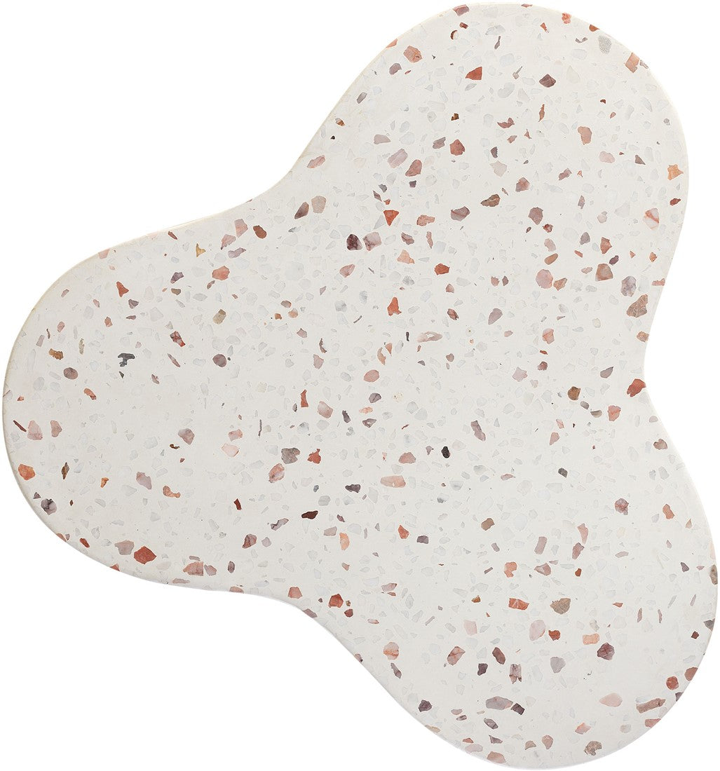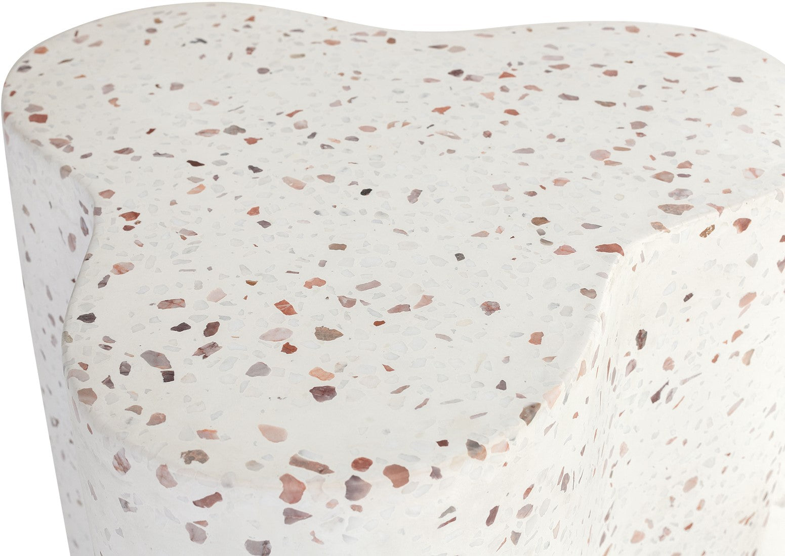 Shaped to resemble a three-leaf clover, its distinctive design catches the eye and adds a touch of charm to your space. It's crafted from white terrazzo, a material lauded for its durability and unique visual appeal, enabling it to flourish both indoors and outdoors. This stool offers additional seating for guests and, when not in use, its surface is perfect for displaying decorative pieces.