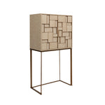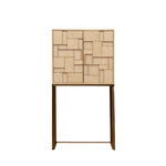 Crafted from bleached grey oak, the cabinet features a striking mosaic design that adds depth and dimension with its three-dimensional texture. Behind the sculptural front lies ample shelved storage, perfect for organising kitchen or bar essentials. The design is elevated by a sleek brushed brass-finished metal frame, lending a touch of mid-century sophistication.