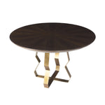 Its round smoked eucalyptus tabletop showcases a subtle sunburst pattern, exuding elegance with a refined, natural touch. Below, a sculptural metal base adds an industrial edge, featuring striking zig-zag angles and a brushed brass finish that enhances both stability and artistic appeal.