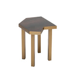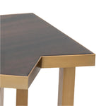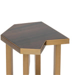 Its bold geometric tabletop, crafted from glossy smoked eucalyptus veneer, showcases sleek lines and rich wood grain, drawing the eye with its refined beauty. Resting on sturdy stainless steel legs with a luxurious brushed brass finish, it offers both style and stability. A matching brass trim seamlessly ties the design together, adding a touch of opulence.