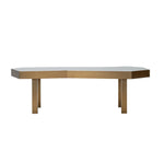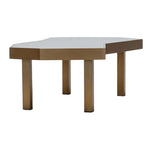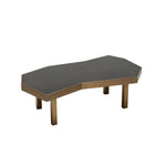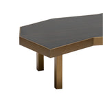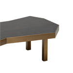 Resting on sturdy stainless steel legs with an opulent brushed brass finish, it offers both durability and style. The tabletop, crafted from glossy smoked eucalyptus veneer, features sharp angles and a striking geometric design, accentuated by a matching brushed brass trim. A perfect centrepiece for your living room or conservatory, it’s an inviting spot for coffee, cocktails, or conversation.