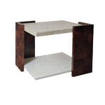 Featuring a polished crystal stone top and lower shelf, it offers a sleek, light-reflective surface that adds refinement and elegance. The bold matte walnut burl legs provide a rich contrast, grounding the design with warmth and natural texture. Compact yet impactful, it serves as a practical platform for essentials or décor, offering surface space without overwhelming the room.