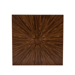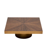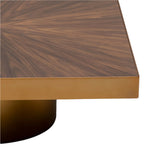 The walnut veneer top, with its warm tones and intricate sunburst pattern, pays homage to mid-century elegance, while the brushed brass base adds a contemporary, Art Deco-inspired touch. The contrast between the wood’s natural warmth and the metallic sheen of brass creates a striking balance of colours and textures.