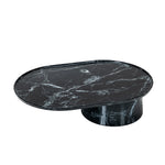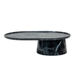 Featuring a sleek black marble top paired with a sculptural stainless steel base finished in rich faux marble laminate, this table exudes contemporary luxury. Its low, generous proportions create a striking focal point, ideal for anchoring modern living spaces. The distinctive marble veining adds natural sophistication, while the sturdy construction ensures both style and durability.