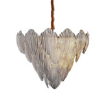 Its cascading silhouette is adorned with textured glass panels, each designed to mimic the delicate form of mulberry leaves. The layered arrangement creates a dynamic interplay of light and shadow, adding depth and movement. Antique brass metalwork provides a refined contrast, enhancing the chandelier’s luxurious appeal.